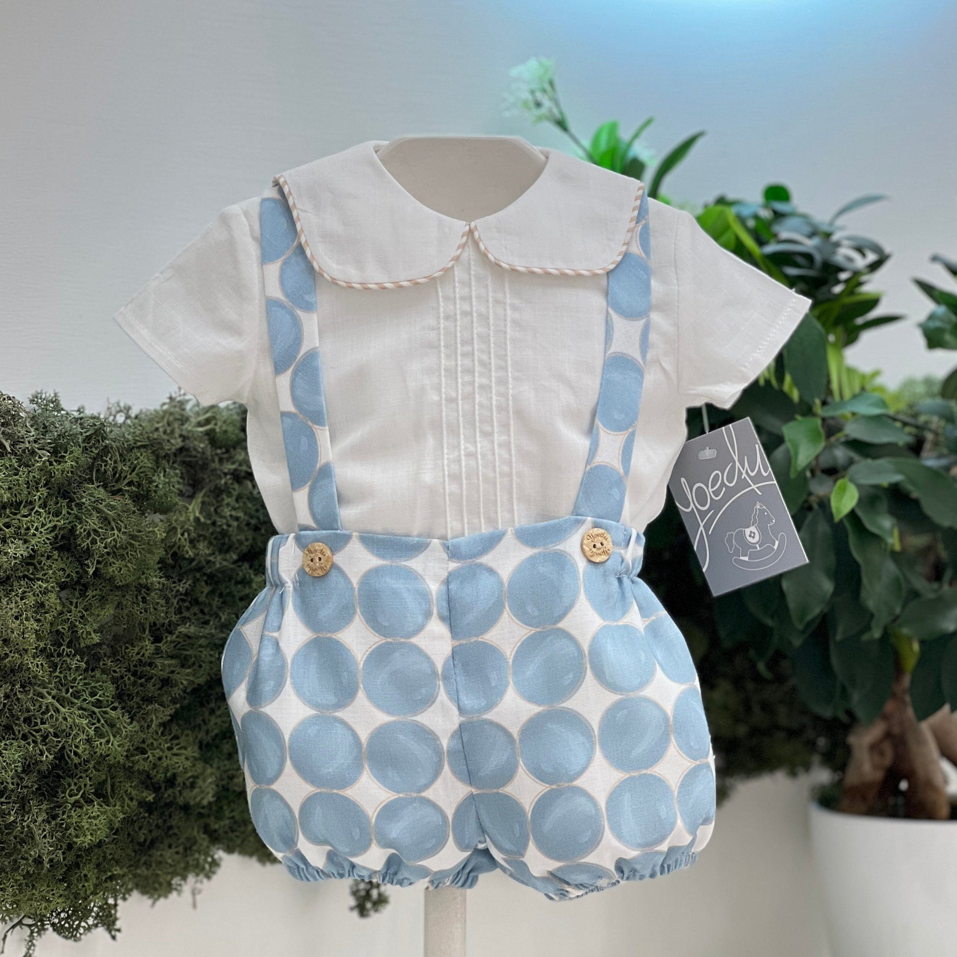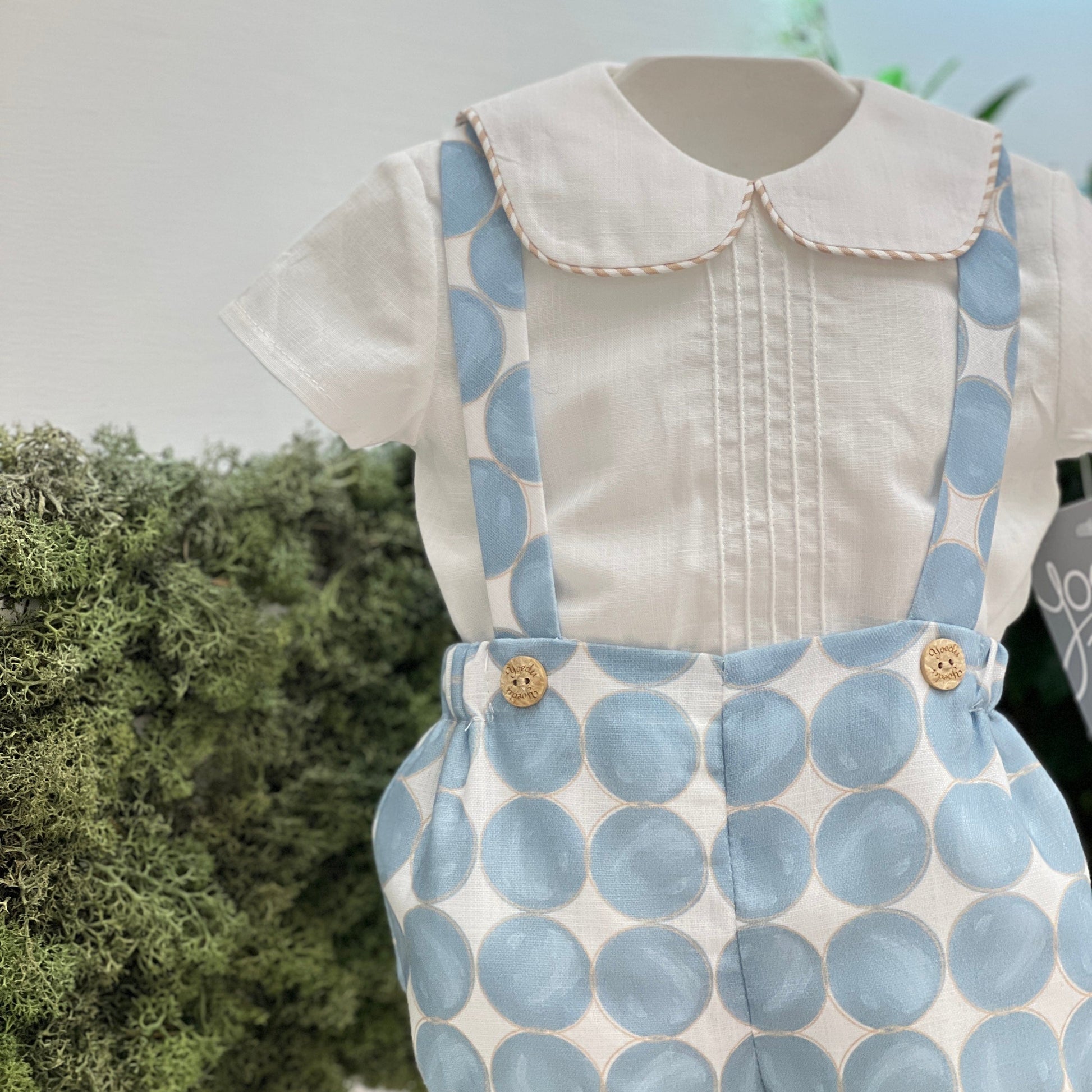 Completo bimbo elegante con pantaloncini dotati di bretelle e camicia con pieghe e abbottonatura sul retro.