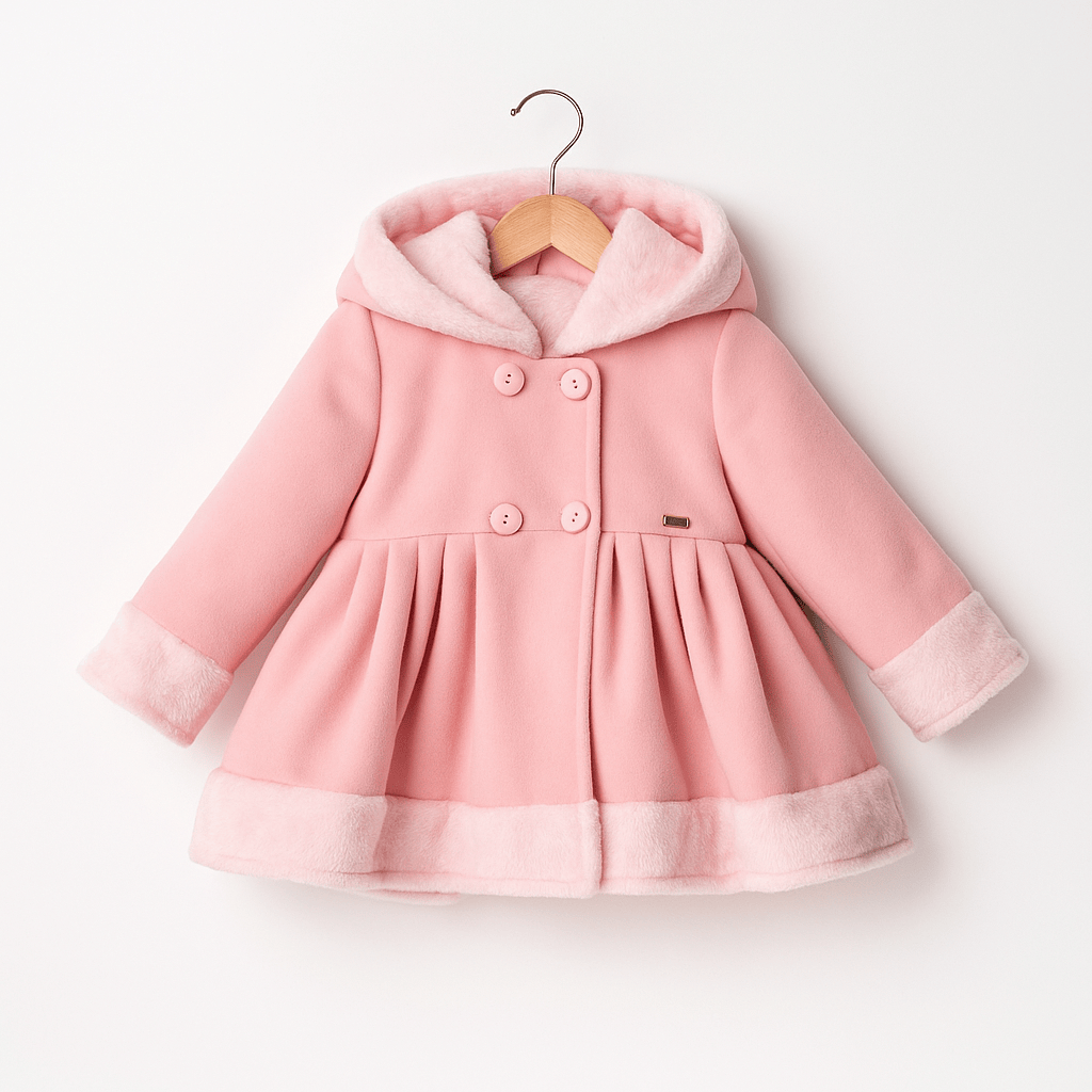 Cappottino rosa doppiopetto con cappuccio, caratterizzato da una linea morbida e da dettagli in pelliccia ecologica su polsini e bordo. La gonna arricciata aggiunge volume e un tocco raffinato, mentre i bottoni tono su tono completano l’estetica elegante. Un modello caldo e prezioso, ideale per un outfit impeccabile nelle giornate più fredde.