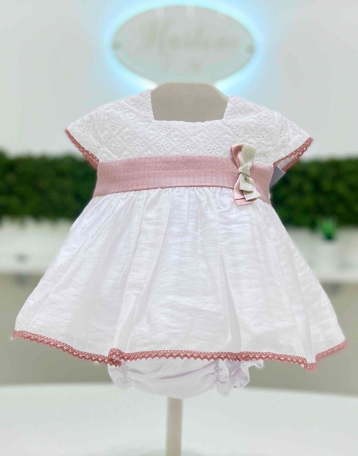 Pagliaccetto neonata con balza, trama ricamata e fiocco.