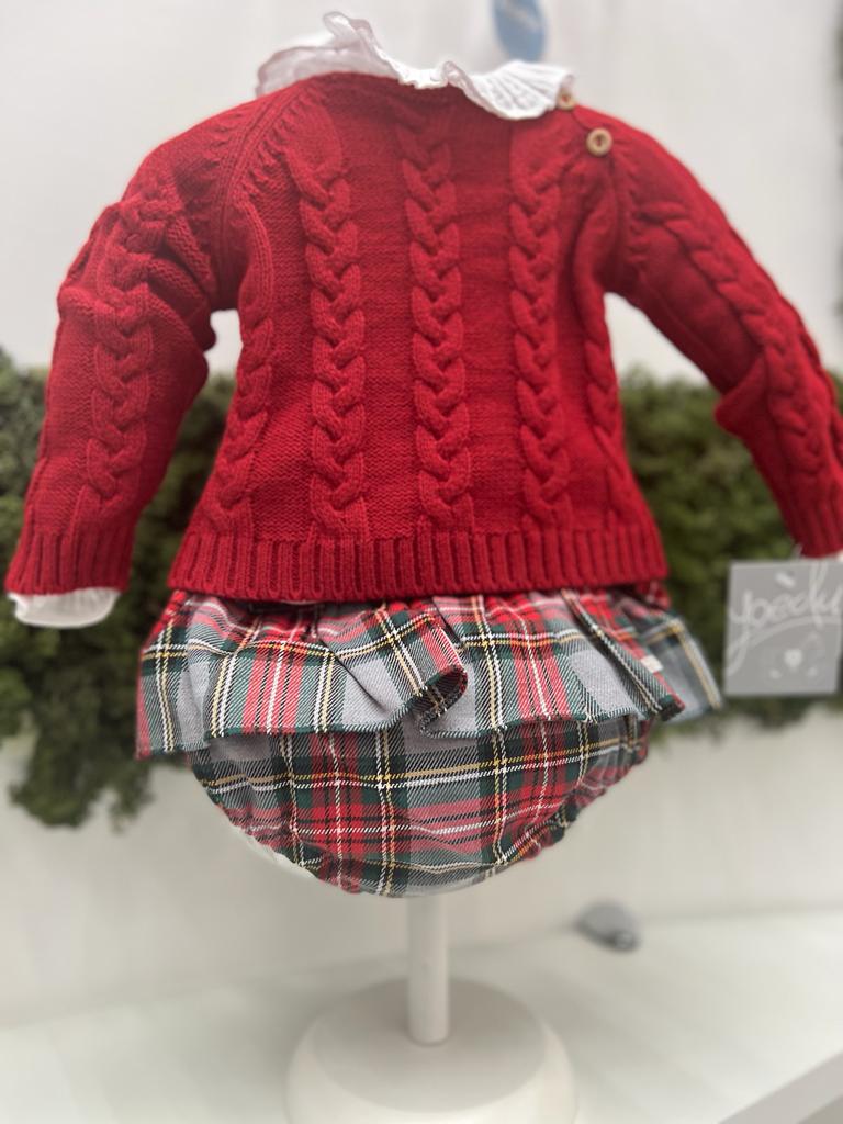 Completo tre pezzi con camicia con colletto con rouches,maglioncino con abbottonatura laterale e culotte fantasia scozzese con balze.