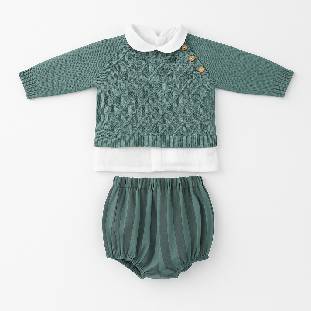 Completo composto da maglia in tricot verde con lavorazione traforata e bottoncini laterali, camicina bianca con colletto integrata e culotte a righe verde con elastico morbido in vita e alle cosce.