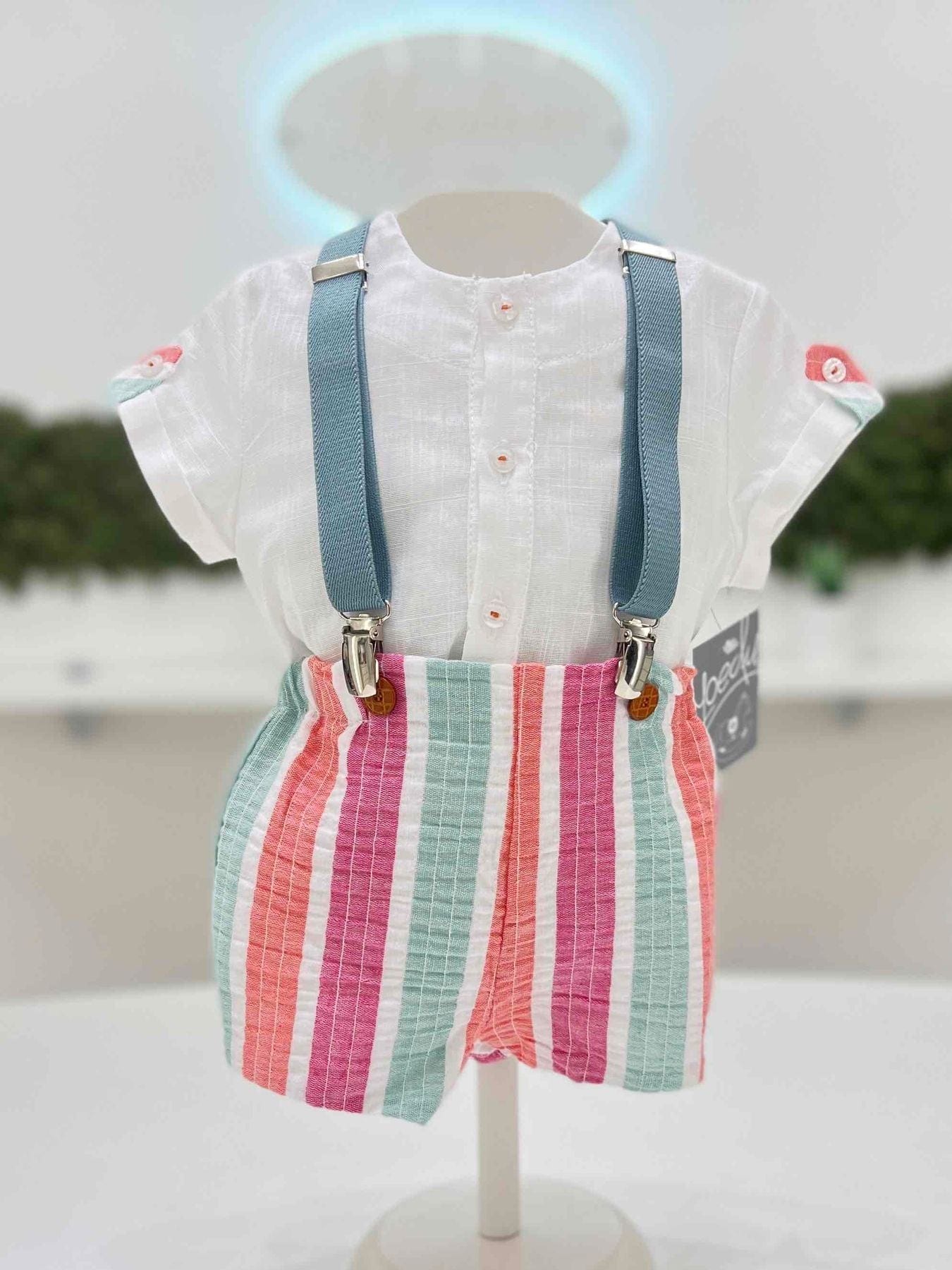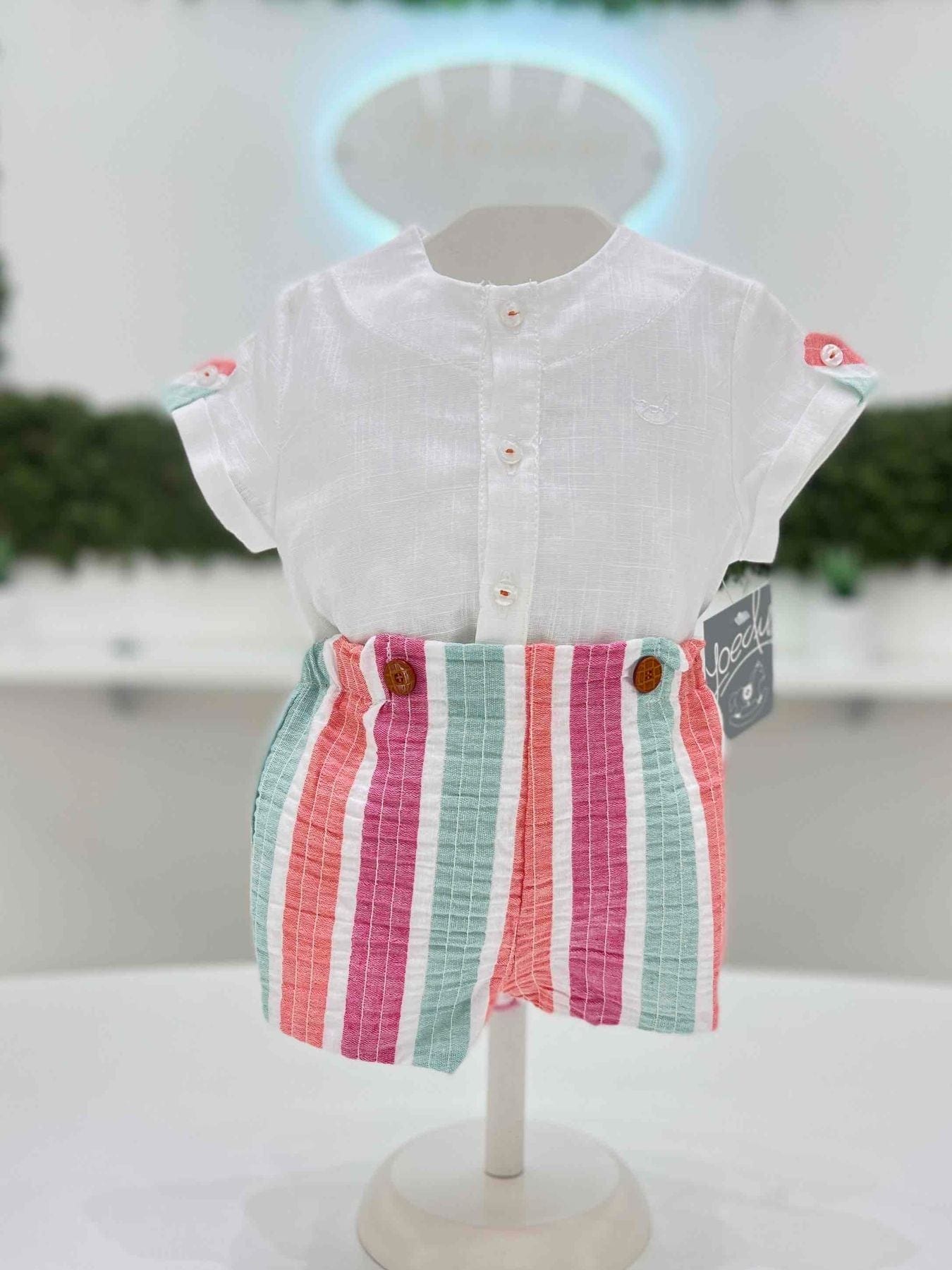 Completo due pezzi con camicia a manica corta e pantaloncino con fantasia a righe multicolor.