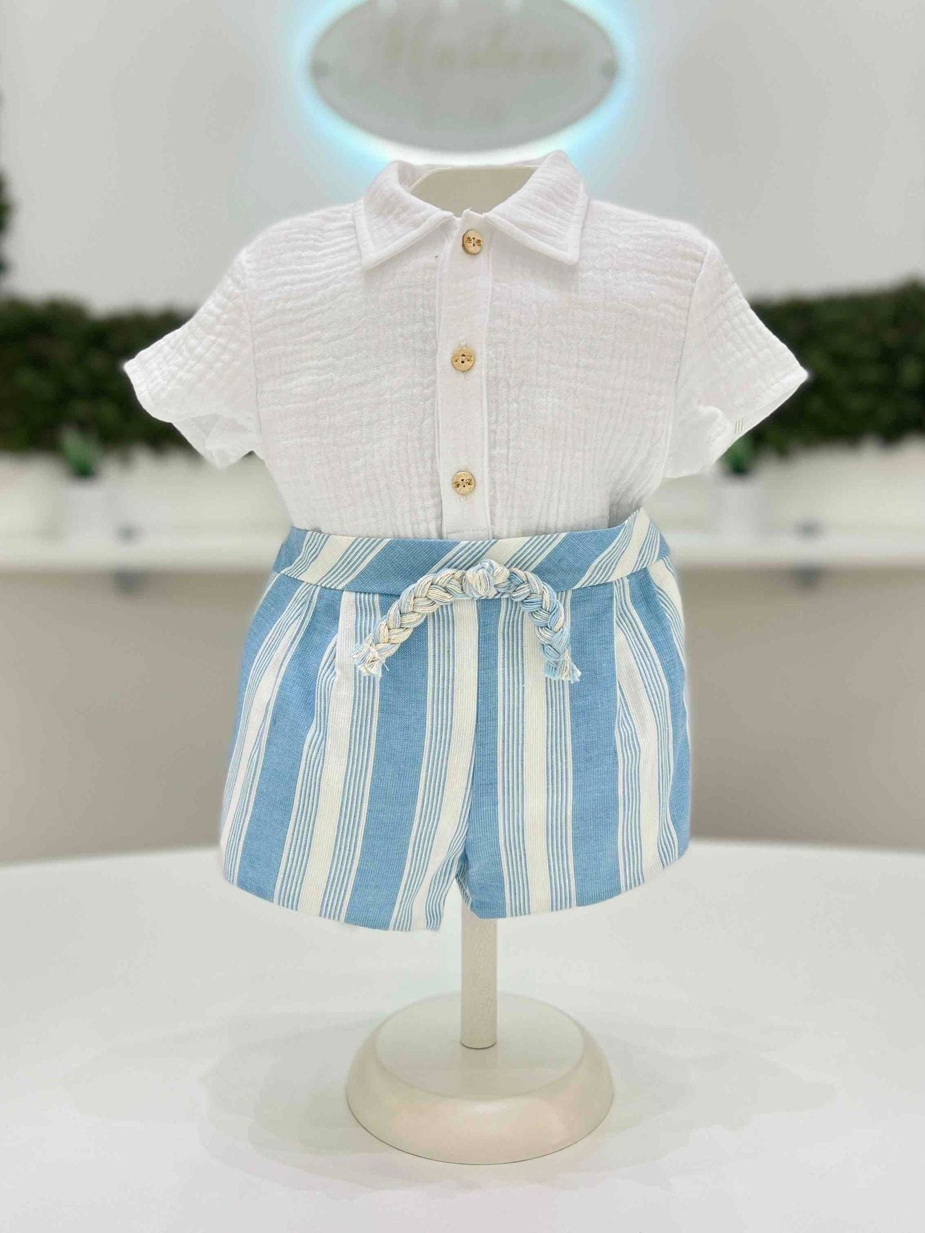 Completo due pezzi in cotone con camicia a manica corta e pantaloncino a righe.