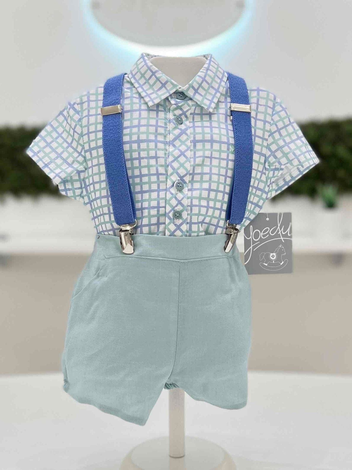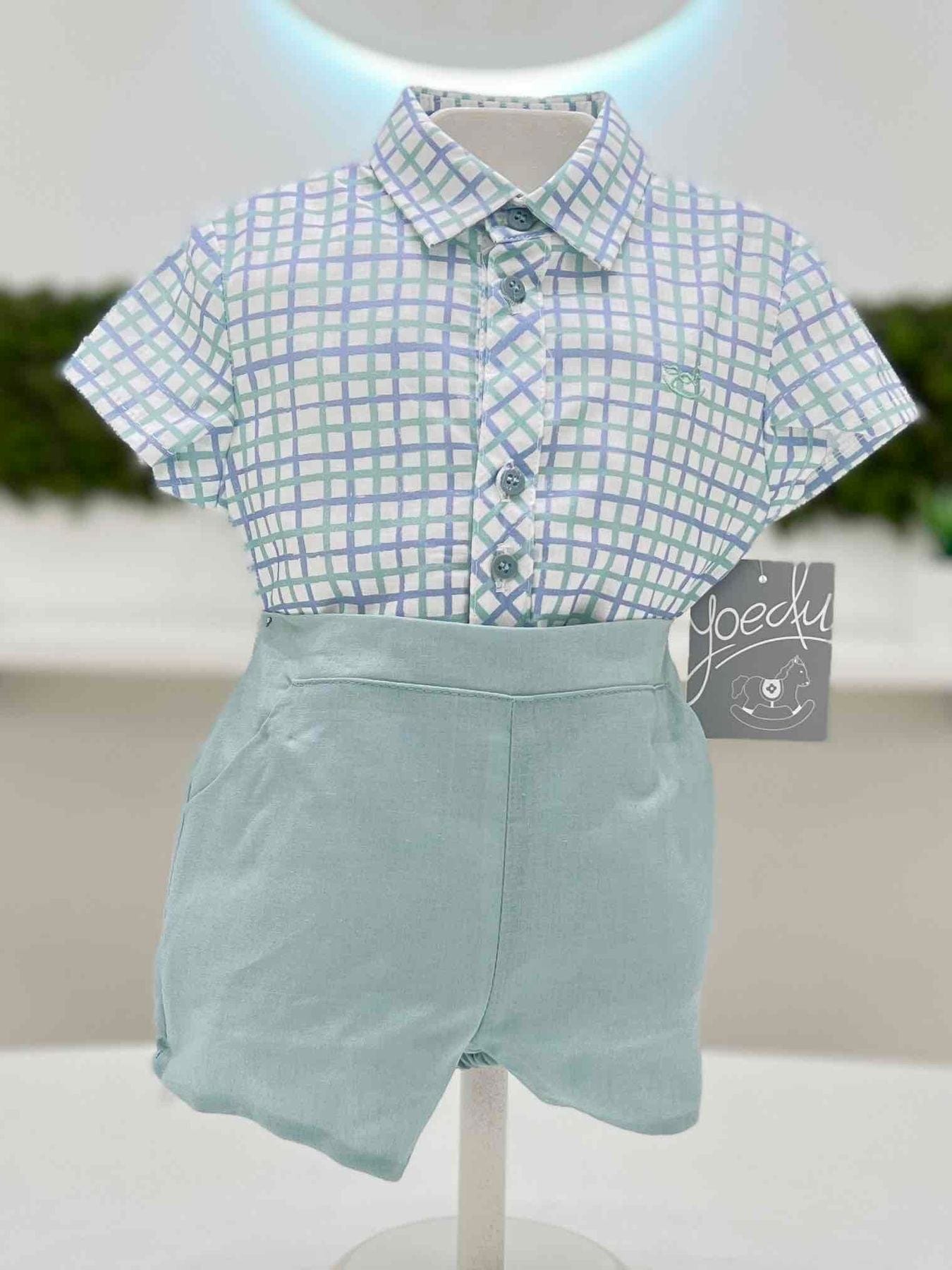 Completo due pezzi in cotone con camicia a quadretti con manica corta e bermuda abbinato.