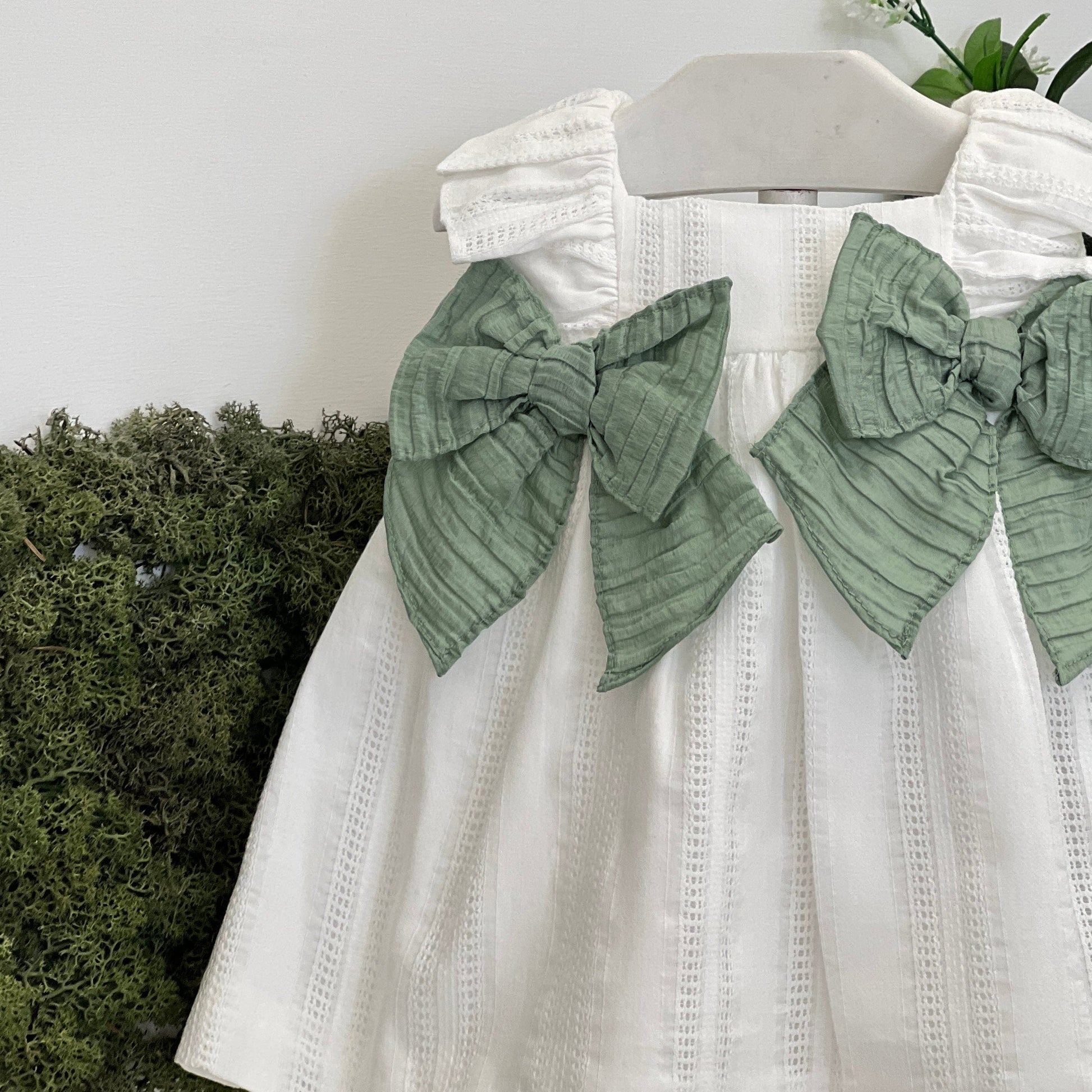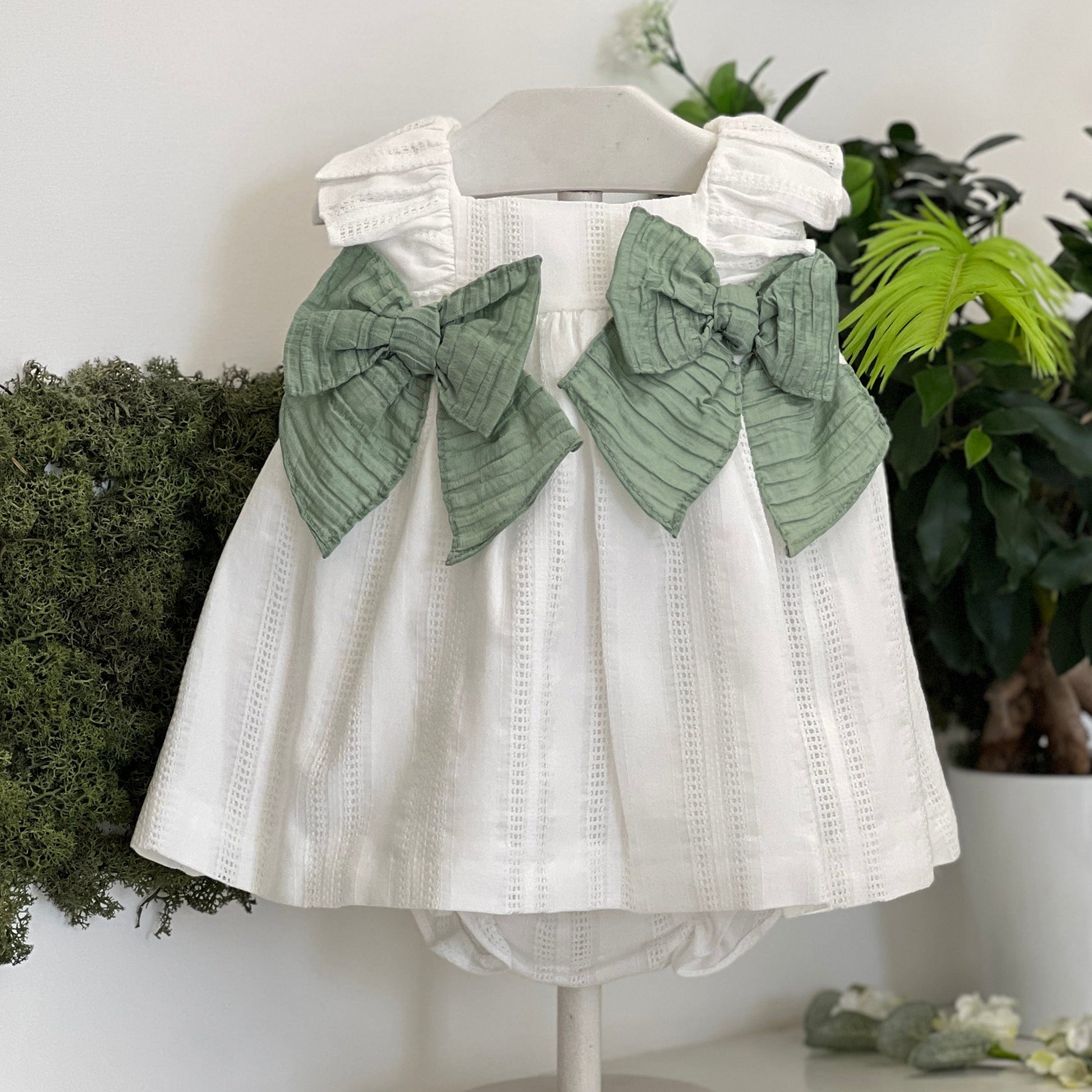 Abitino in cotone con culotte coordinata e fiocchi verdi a contrasto.