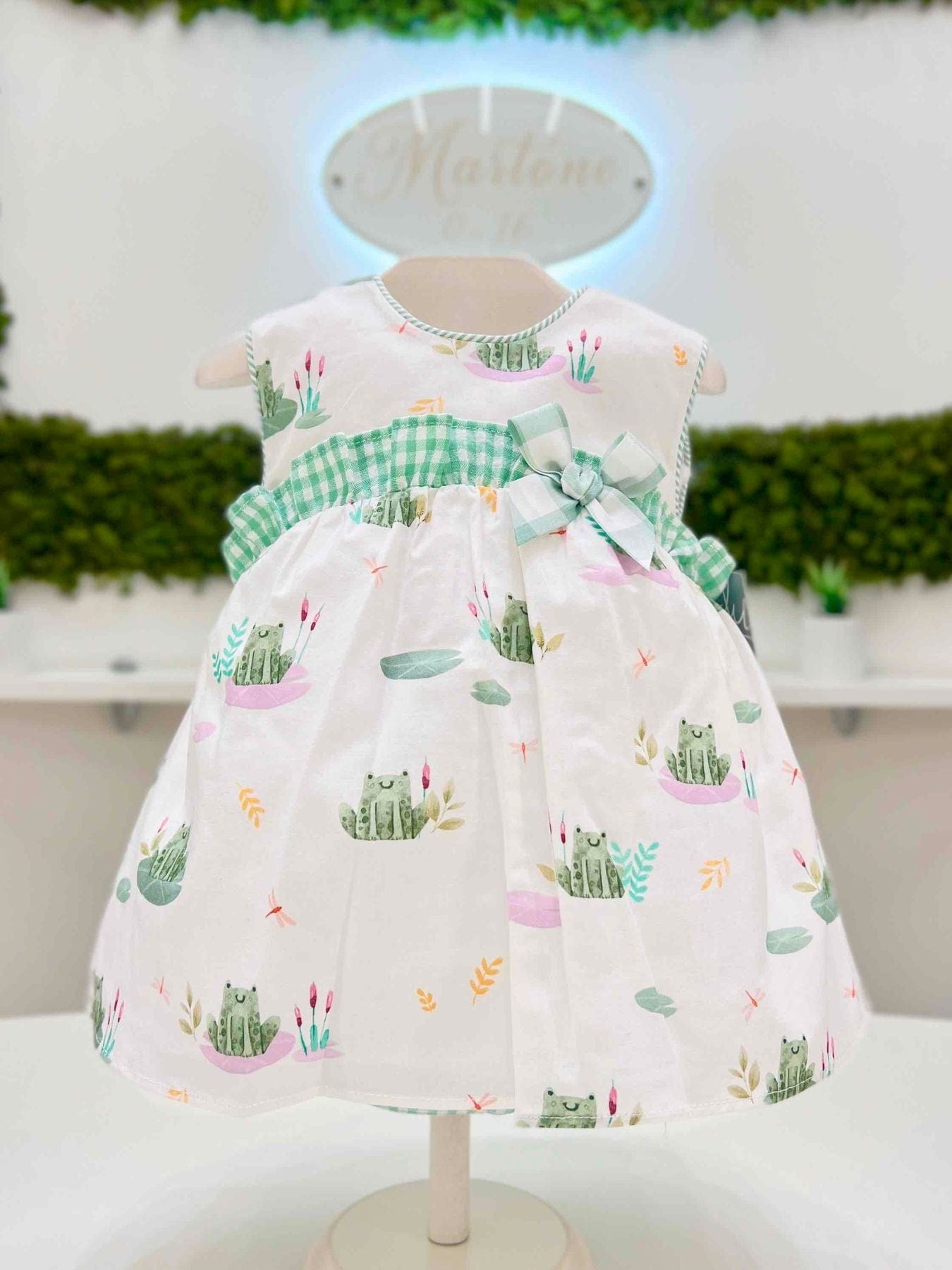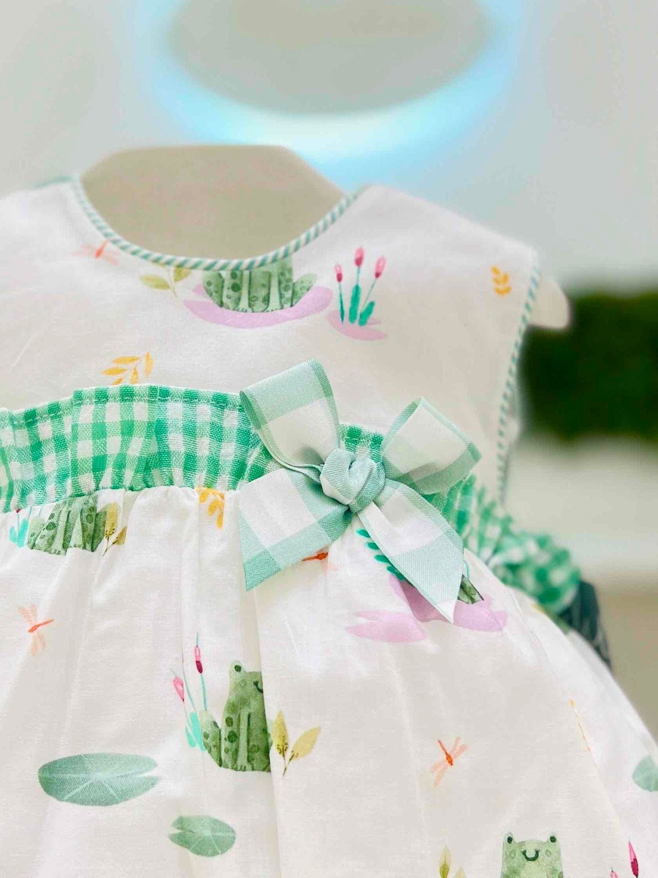 Vestitino neonata in cotone con balza e coulotte vichy, fantasia con rane.