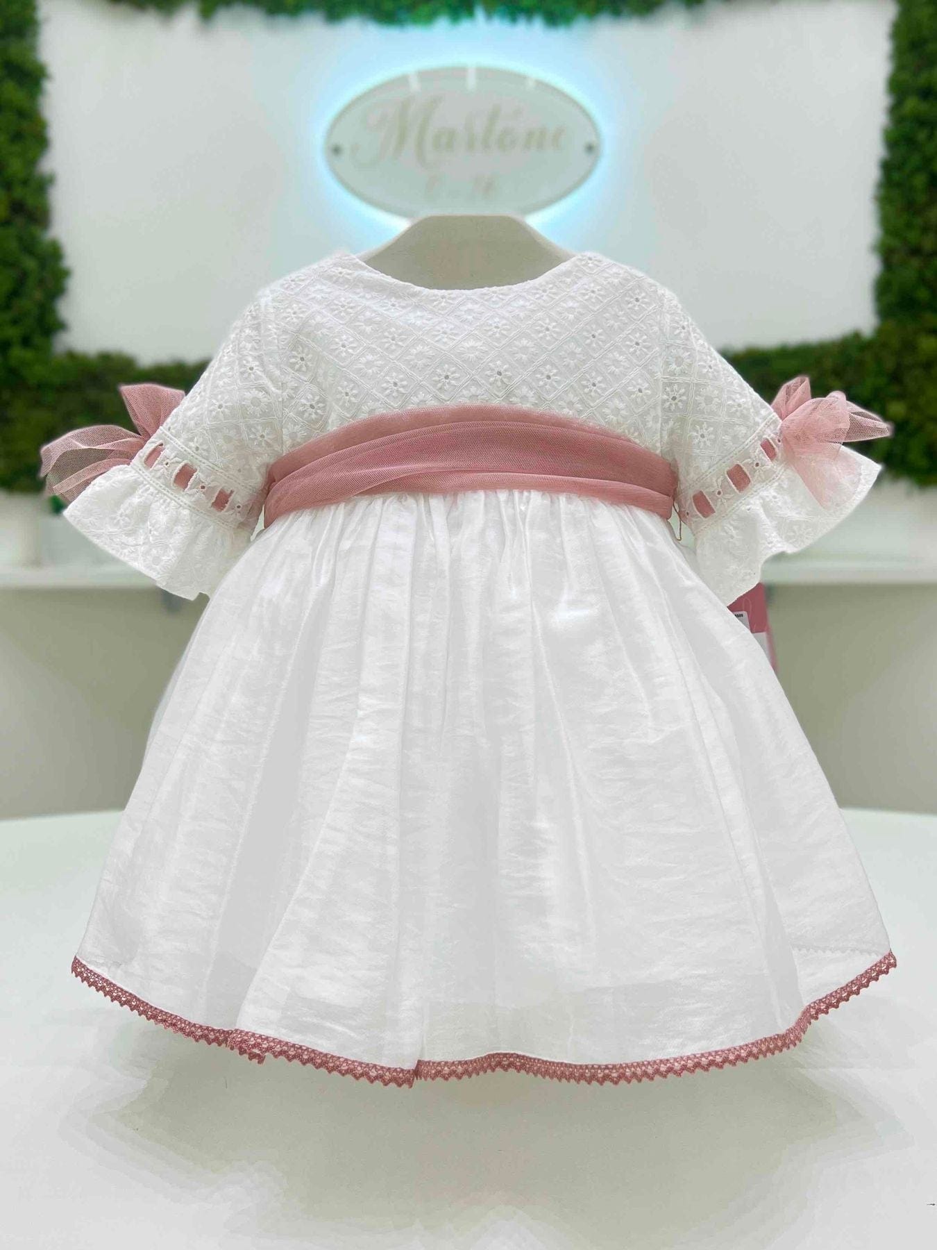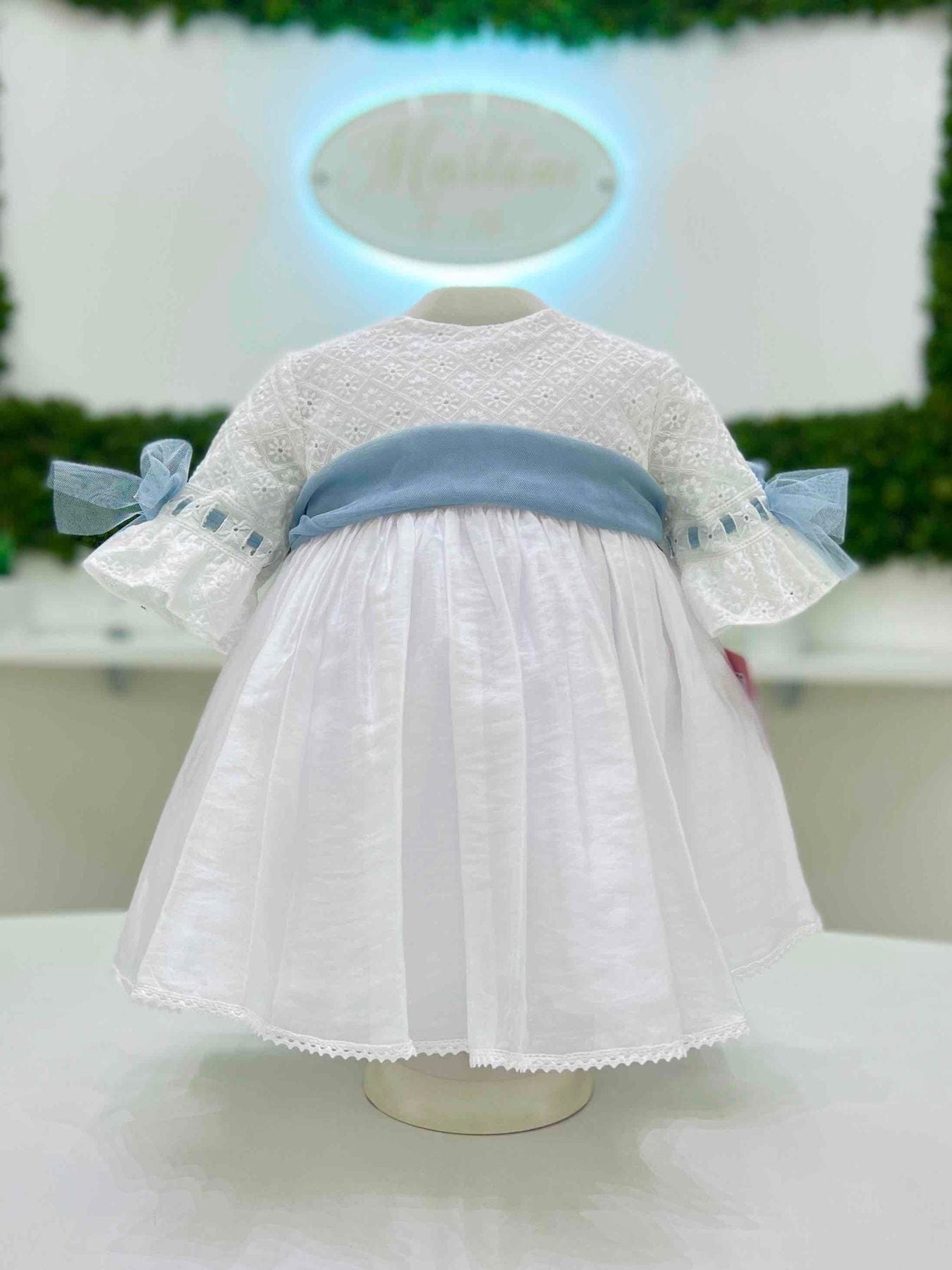 Abitino bimba in cotone con trama ricamata, cintura in tulle con fiocco e fiocchetti sulle maniche.