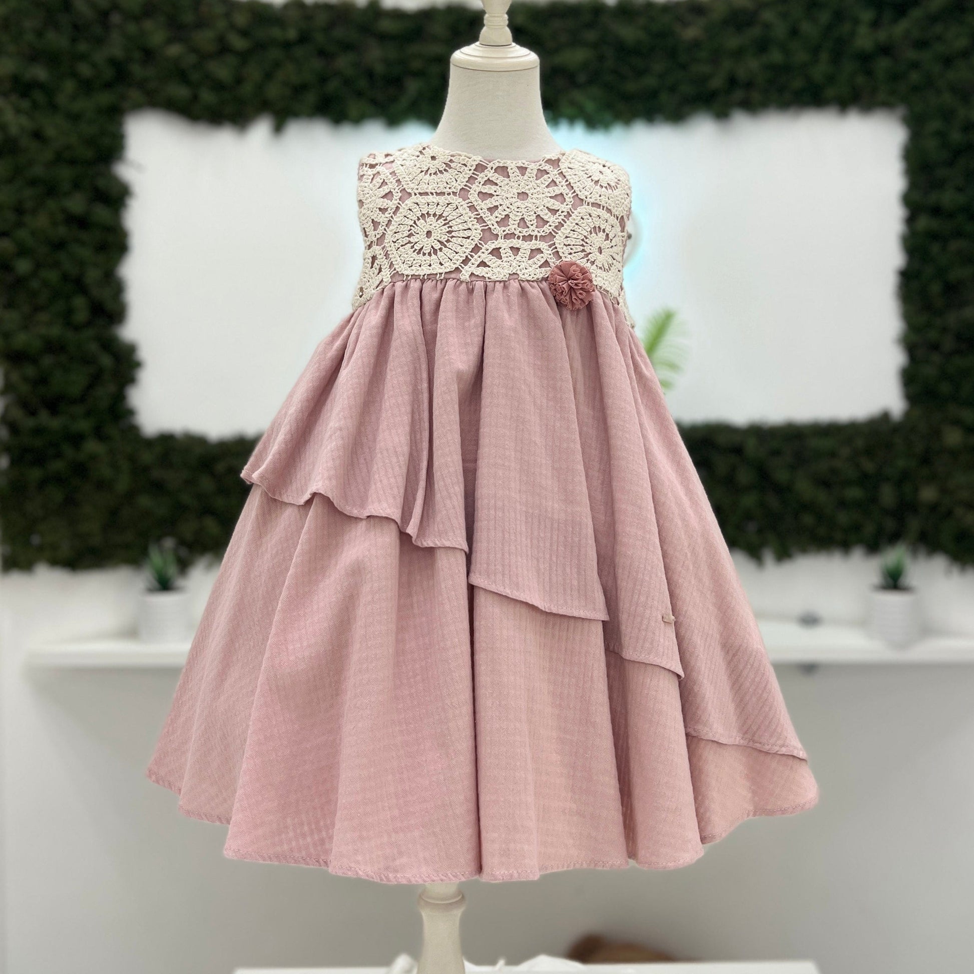 Abito in lino a balze sovrapposte, con corpetto in macramé.
