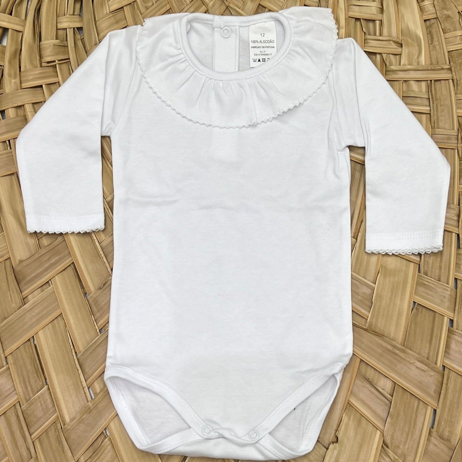 Un body per neonata in 100% cotone, a manica lunga, di colore bianco. Il design semplice ed elegante è arricchito da un colletto arricciato, che aggiunge un tocco di dolcezza e raffinatezza. Perfetto per essere indossato da solo o sotto altri capi, è morbido e delicato sulla pelle del neonato.
