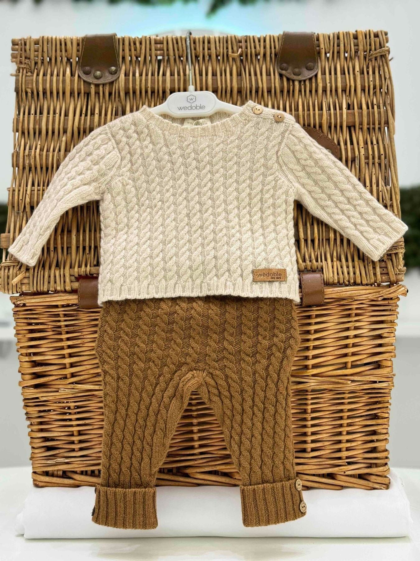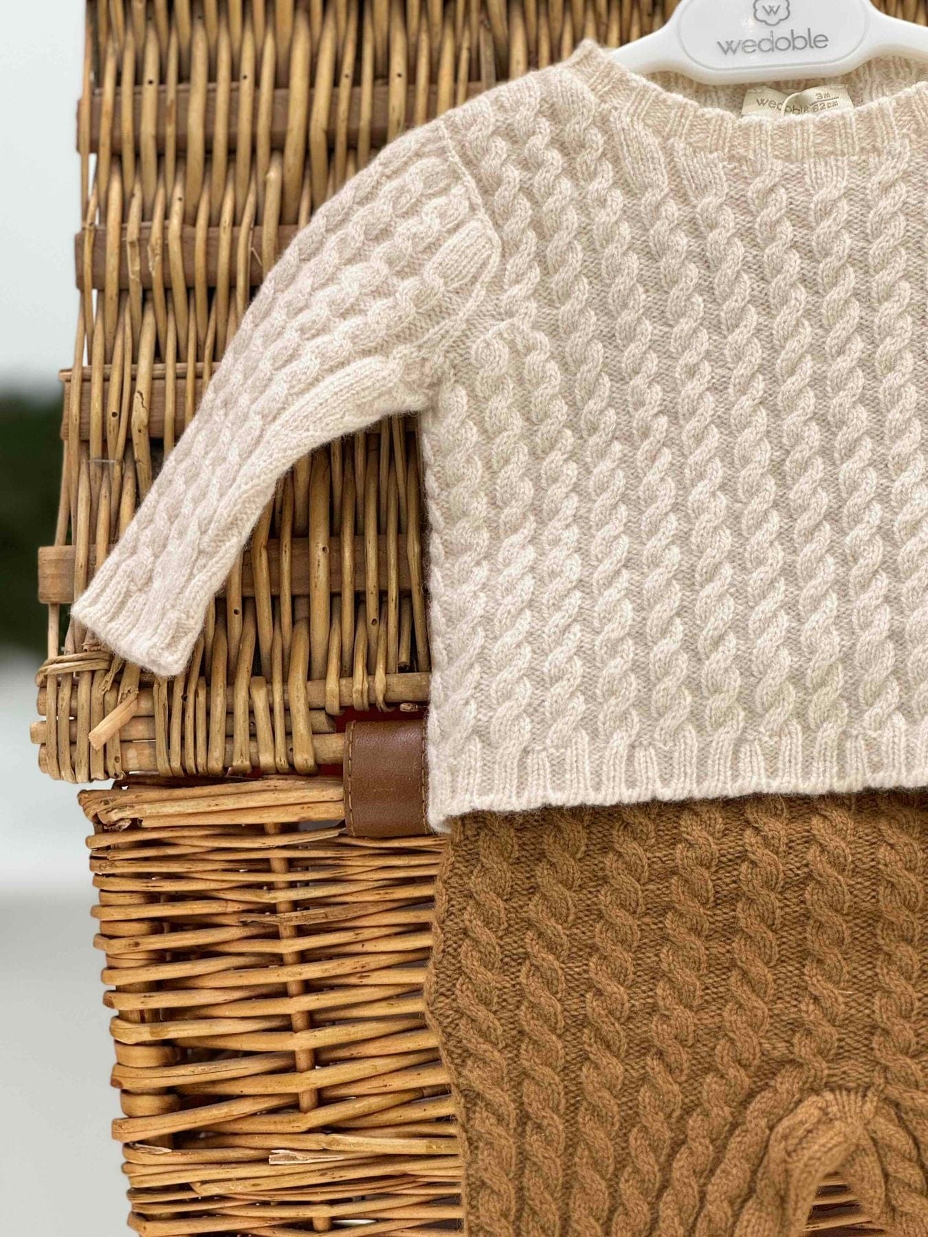 Completo 2 pezzi con trecce pantalone lungo castagno e maglioncino beige