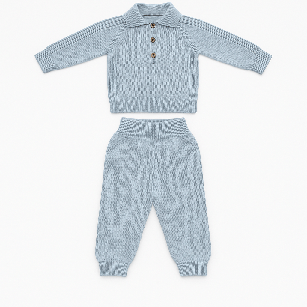 Completo in maglia azzurro composto da maglioncino e pantaloni coordinati.