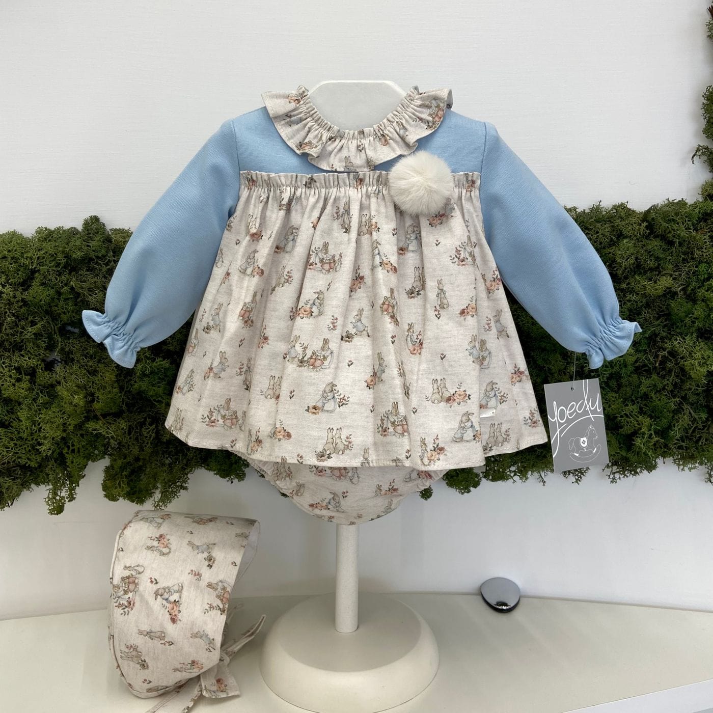 Maglia con rouches a fantasia e pompon, con cuffia e culotte abbinate.