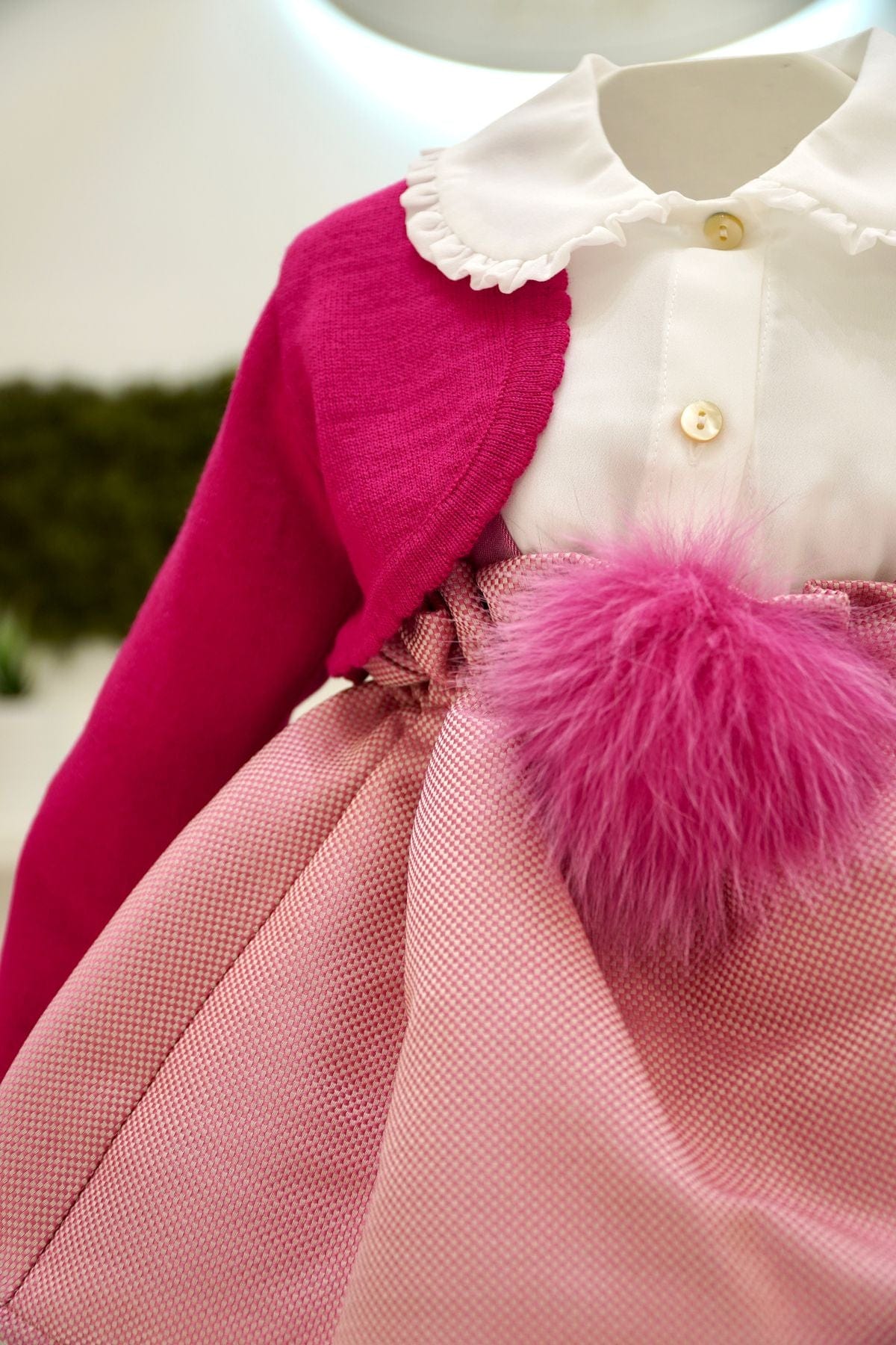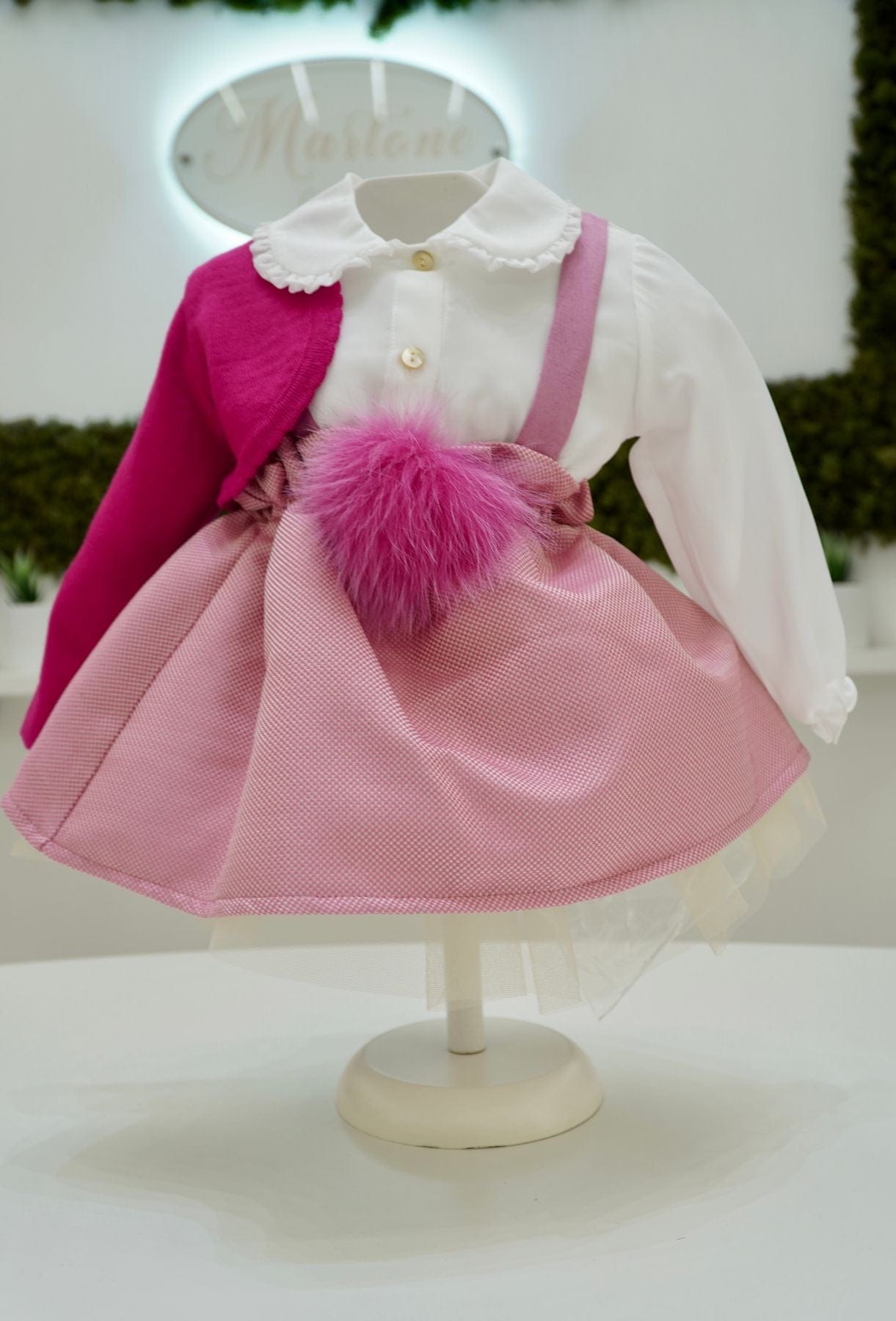 Completo 2 pezzi con Gonna in rosa con Pom Pon e camicia bianca