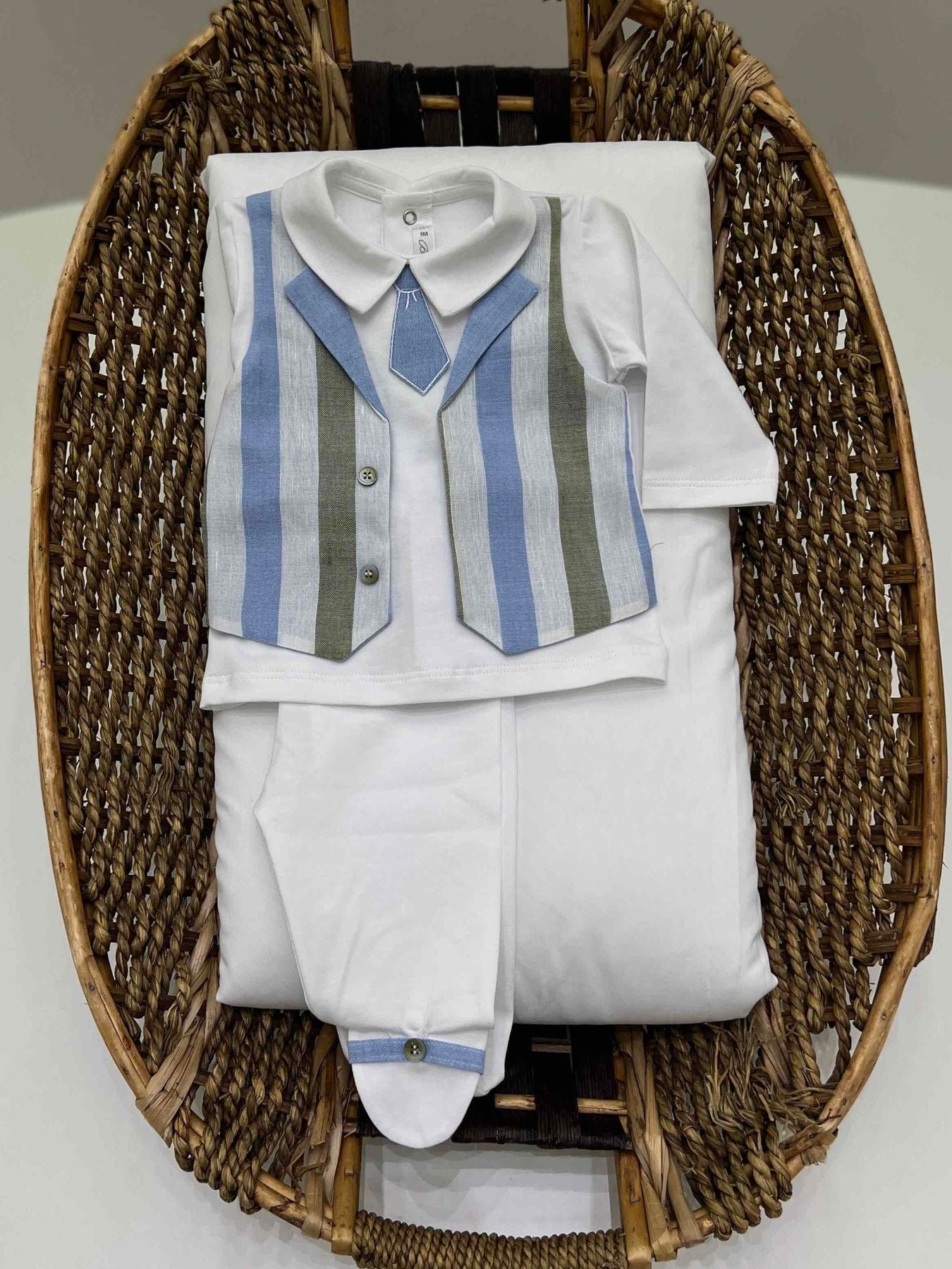 Completo clinico due pezzi neonato con ghettine in 100% cotone con finto gilet e cravatta.