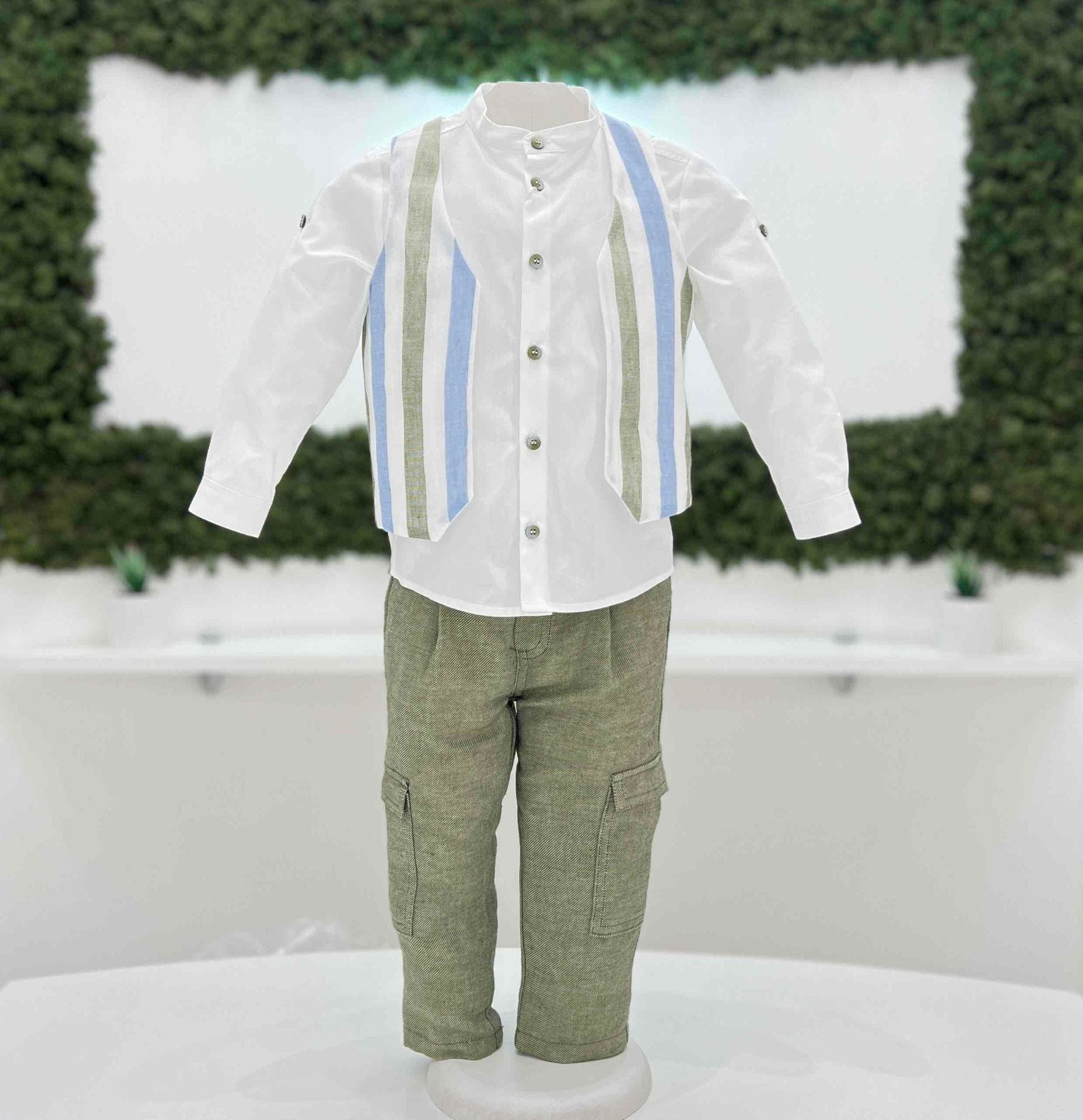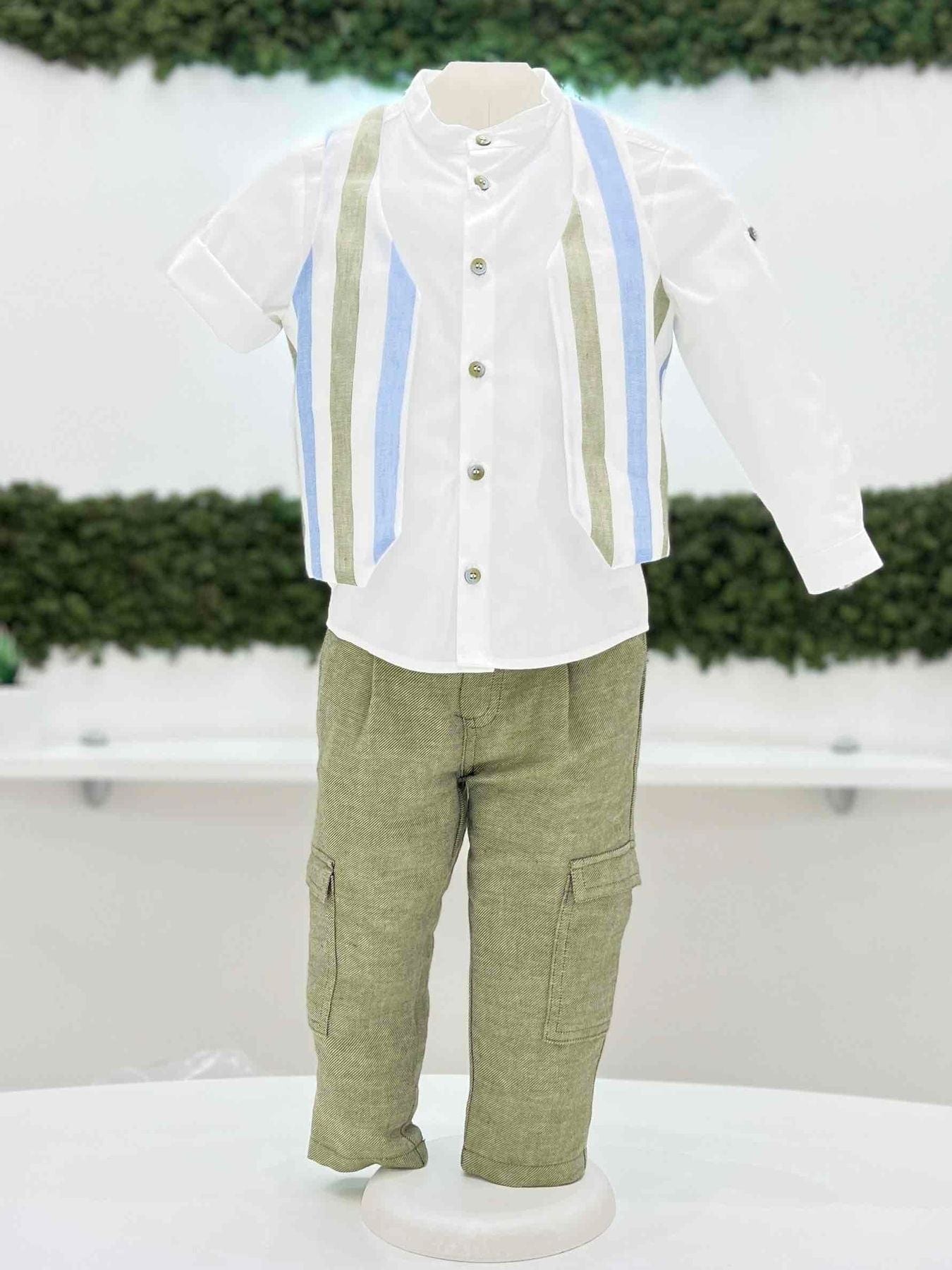 Completo due pezzi con pantalone cargo in lino e cotone verde militare e camicia in cotone con finto gilet a righe in. lino.