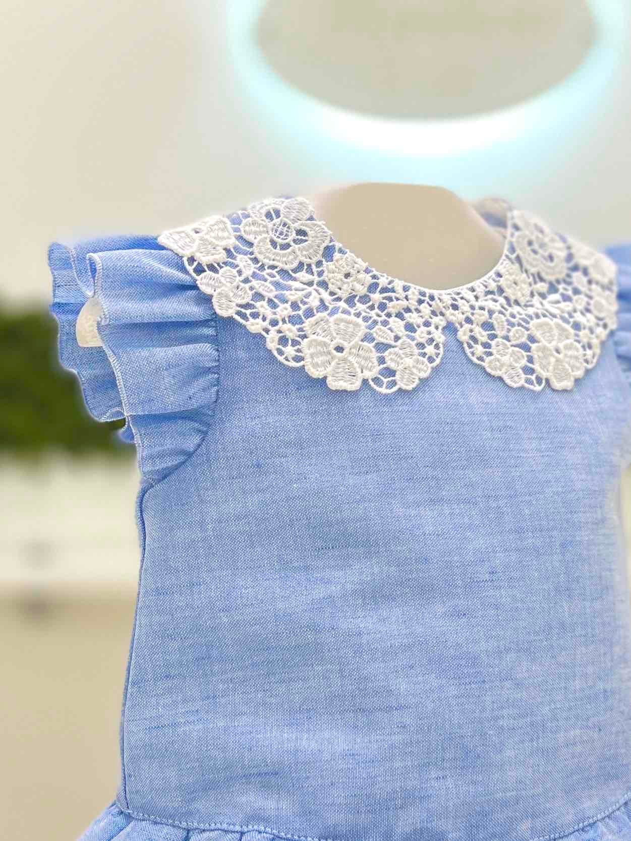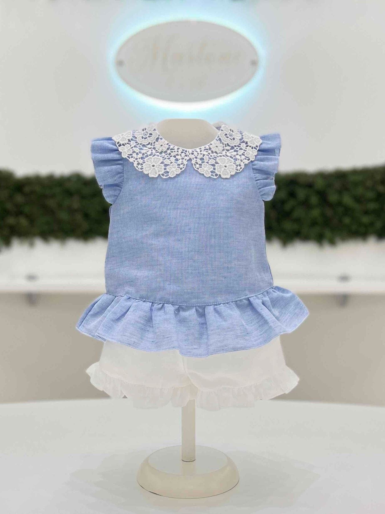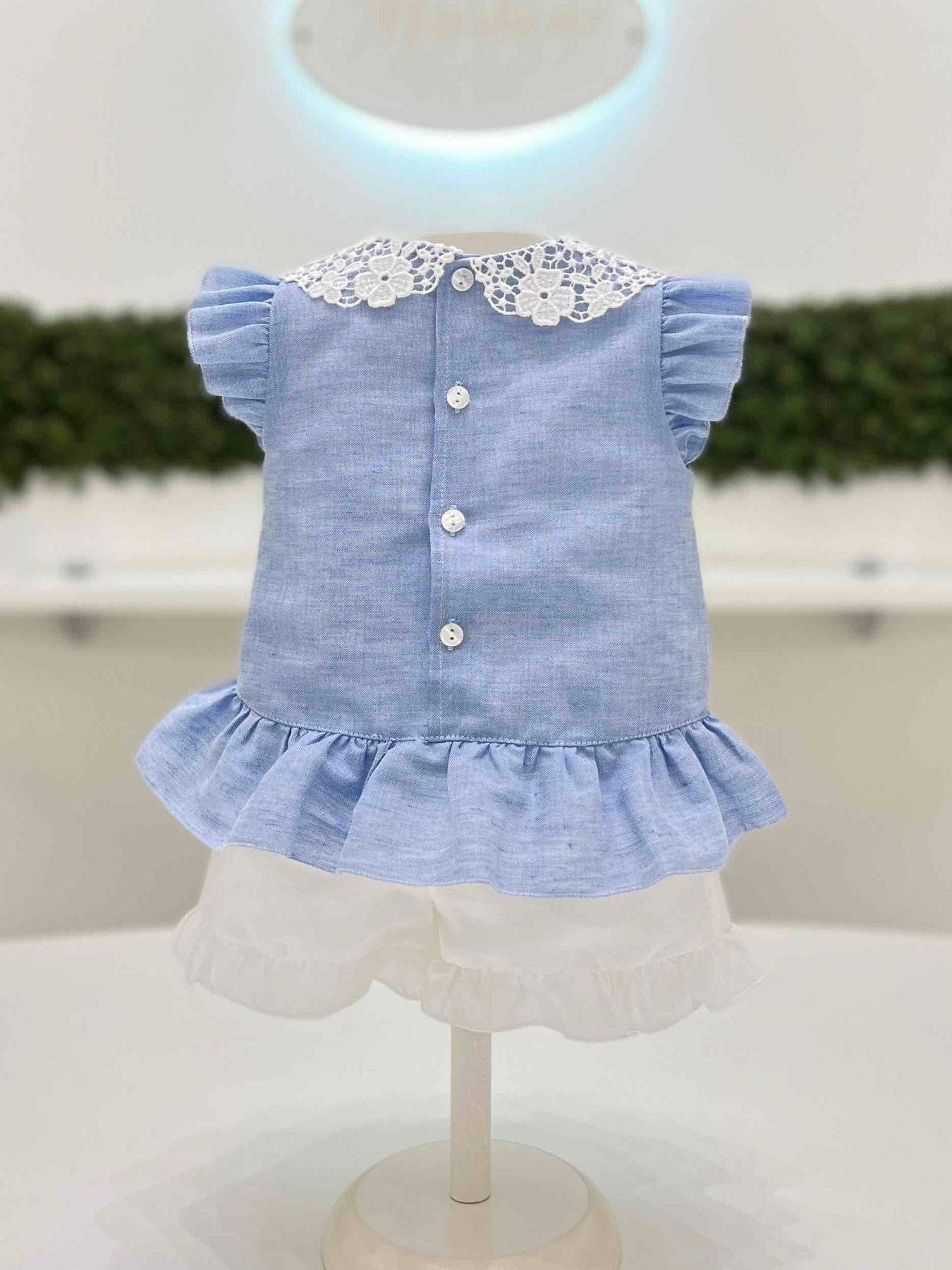 Completo due pezzi bimba in lino con camicia con rouches e colletto in macramè. Shorts bianco in lino con rouches.
