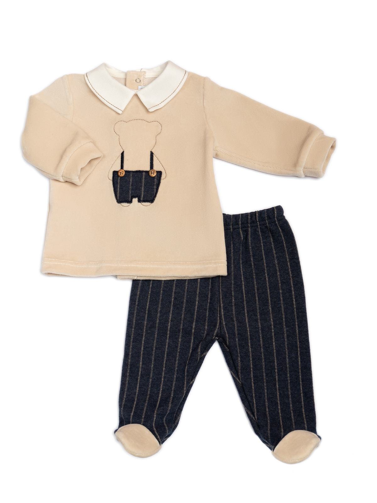 Completo due pezzi per neonato in caldo cotone elegante e confortevole, composto da pantalone gessato blu e una maglia beige con colletto, offrendo uno stile raffinato e perfetto per le occasioni speciali, mantenendo il piccolo sempre a suo agio.
