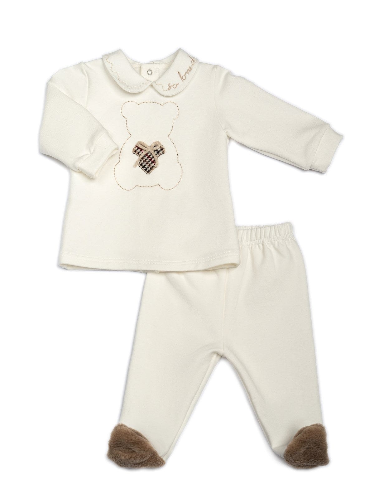 Scopri la dolcezza e il comfort di questa tutina spezzata in due pezzi, realizzata in morbida ciniglia. Il set include un pantalone gessato, che dona un tocco di eleganza e raffinatezza, e una maglia adorabile decorata con un tenero orsetto ricamato. Ideale per mantenere il tuo piccolo al caldo e comodo, questo completo è perfetto per ogni occasione, unendo stile e praticità in un'unica soluzione. Disponibile in varie taglie per adattarsi alla crescita del tuo bambino.