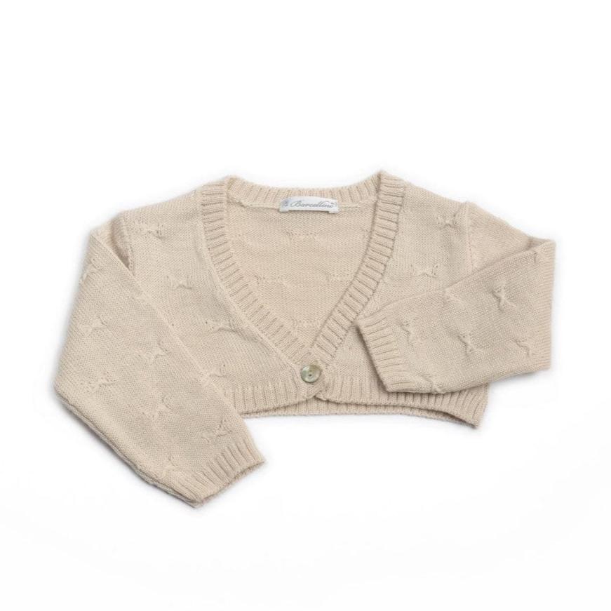 Giacchino in filo panna con abbottonatura frontale. - Polsini e bordo del capo realizzati con lavorazione a costine.