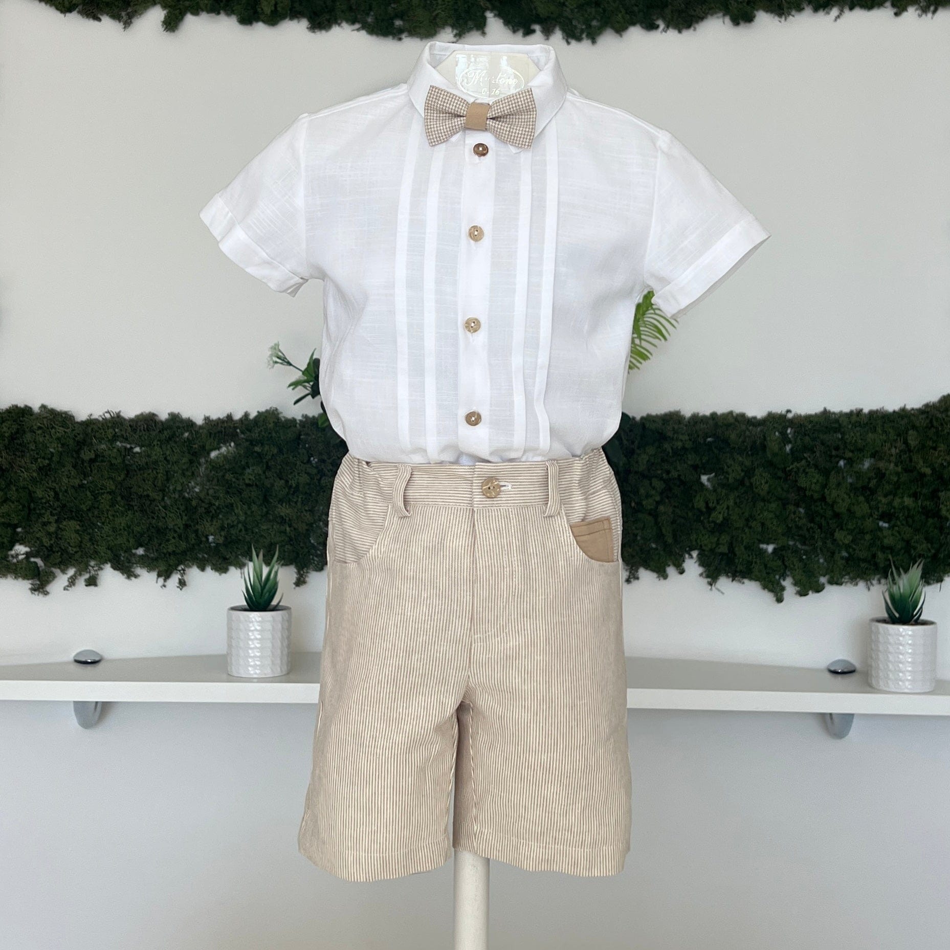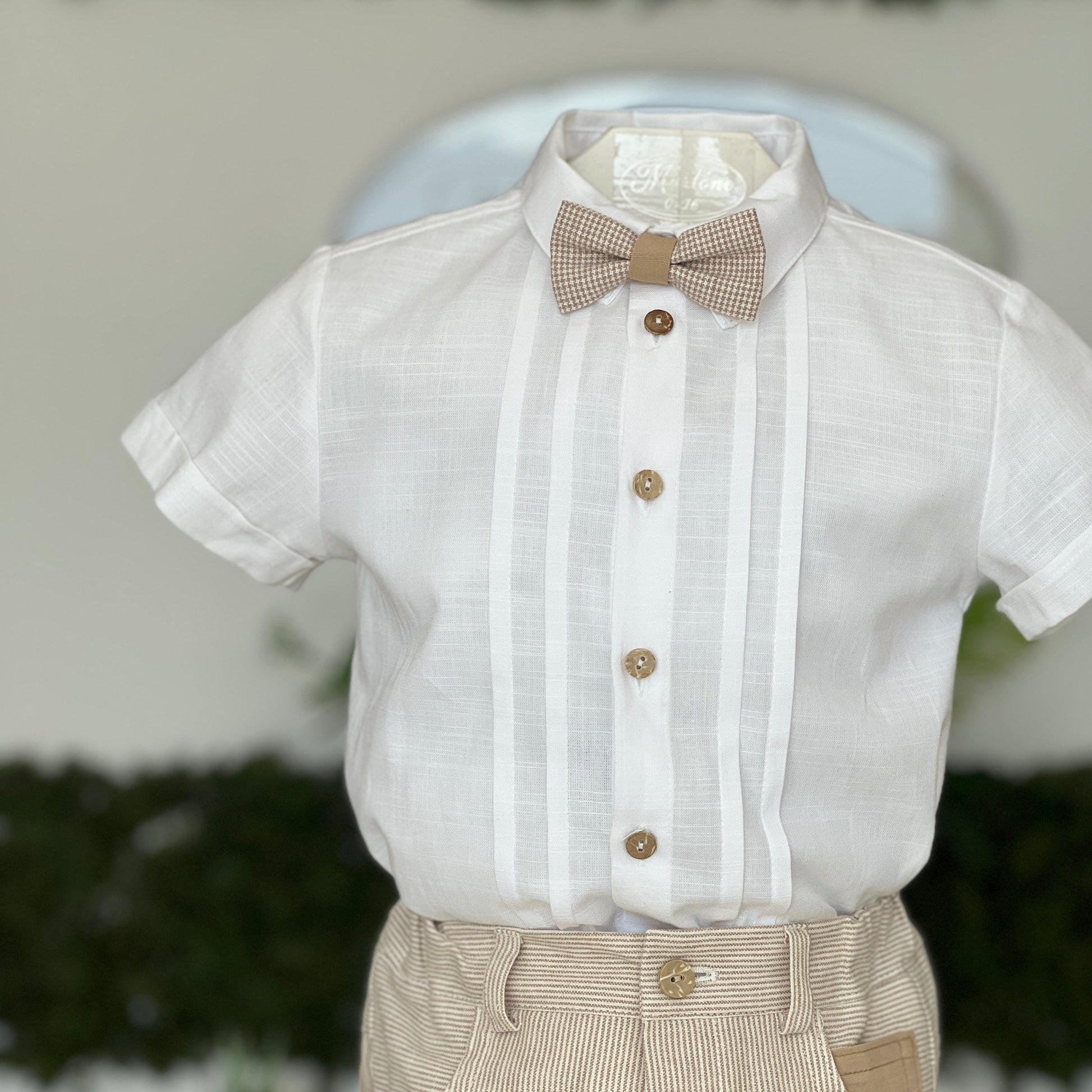 Completo due tre pezzi, camicia in lino, manica corta e pieghe frontali, pantalone effetto millerighe, con papillon coordinato.