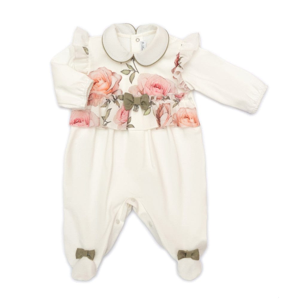 Graziosa tutina da neonata in jersey elasticizzato bianco, con una delicata stampa a fiori sulla parte superiore che aggiunge dolcezza e femminilità. Il colletto rotondo profilato e il volant al giromanica donano un aspetto dolce e raffinato. Fiocchetti in rasone verde decorano il petto e i piedini. Il modello presenta apertura sul retro e fra le gambe con bottoni a pressione per facilitare il cambio. Un capo ideale per le piccole occasioni.