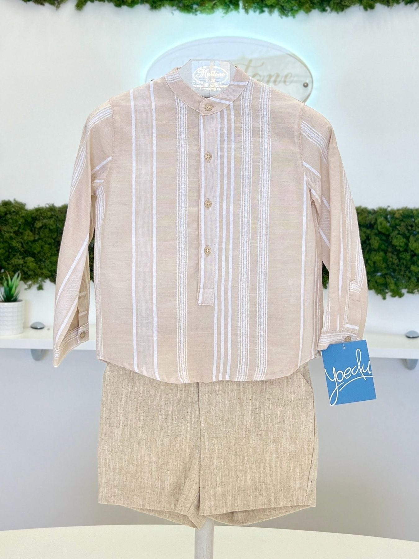 Completo bimbo composto da camicia in lino a righe e bermuda con pince.