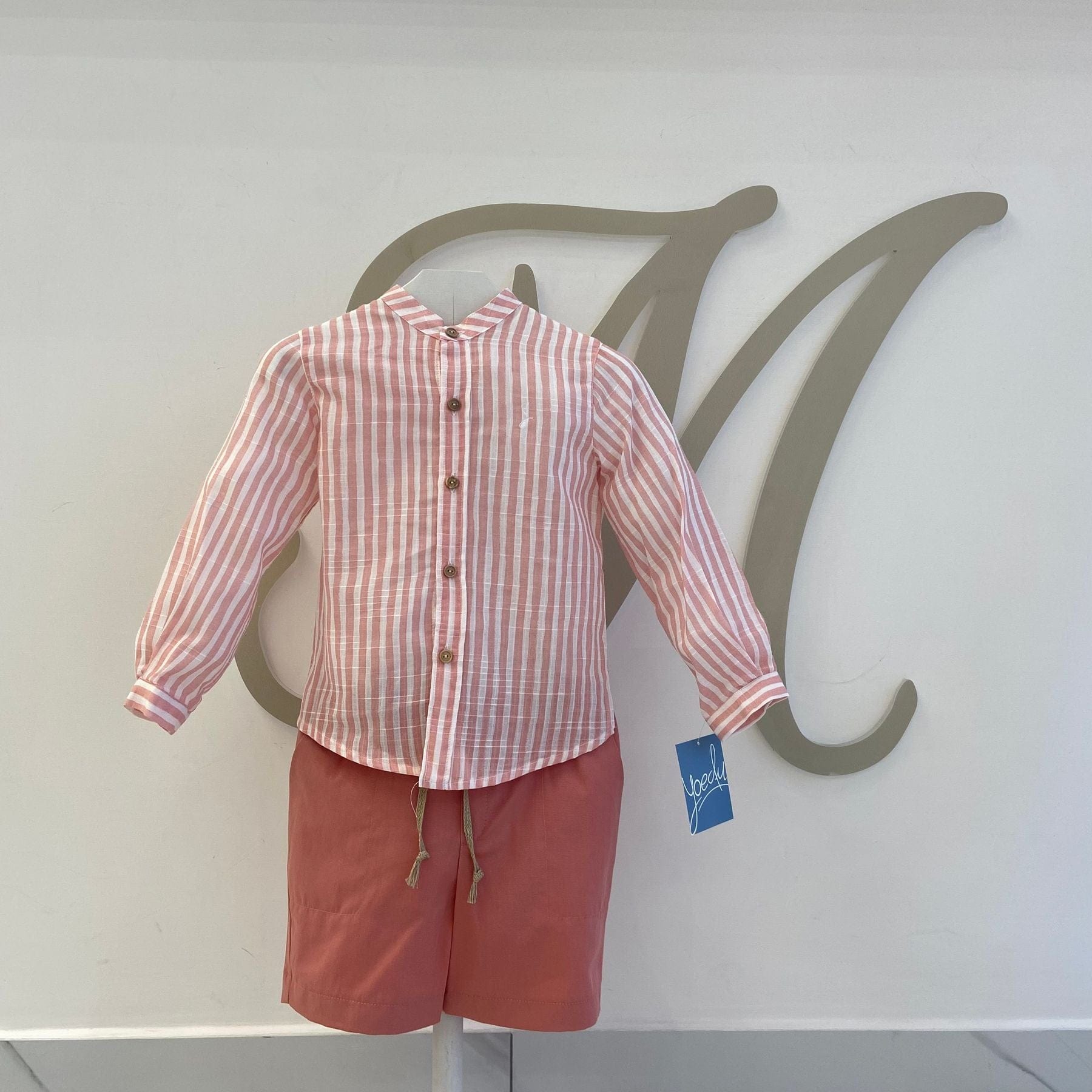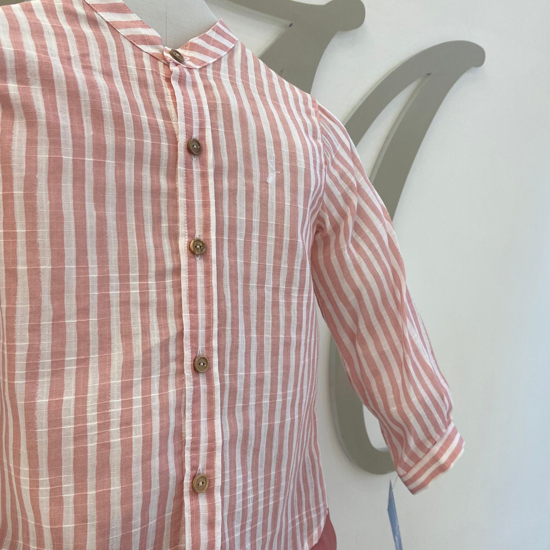 Completo con camicia a righe di lino e con pantalone con finta coulisse ed elastico sul retro.
