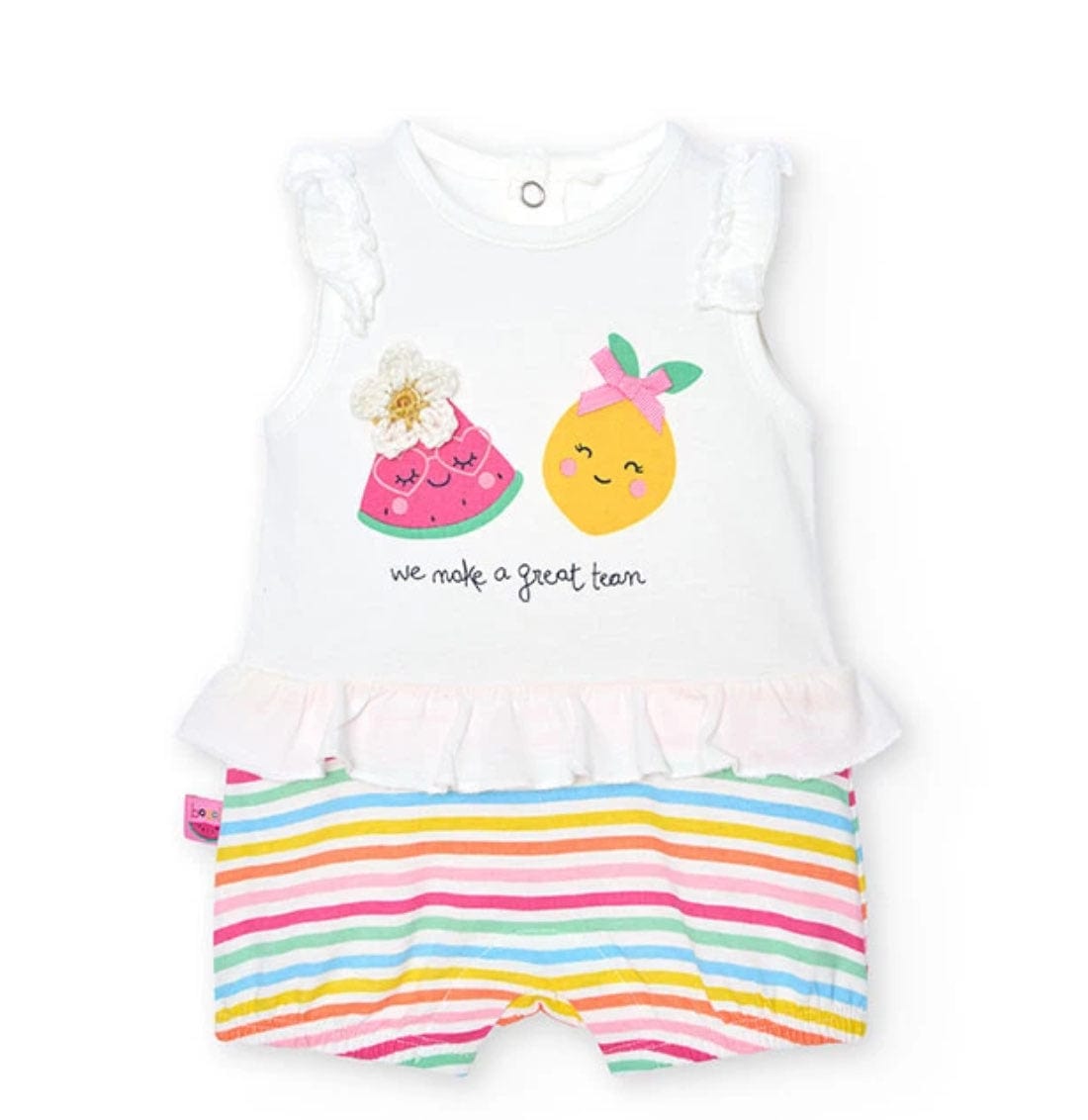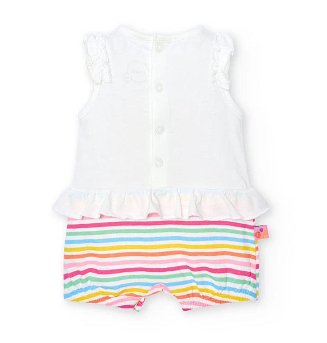 Questo è un grazioso pelele combinato per neonate, è perfetto per l'estate grazie al suo tessuto leggero in punto. Il design a righe e il collo rotondo aggiungono un tocco di stile, mentre le maniche corte lo rendono ideale per i giorni più caldi. Il colore è un bianco puro, che lo rende facilmente abbinabile con altri capi. Questo pelele è un'aggiunta essenziale al guardaroba di ogni neonata.