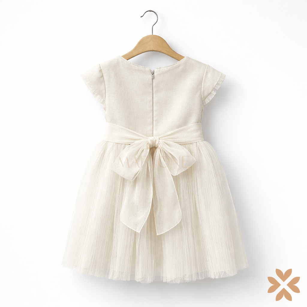 Abito da cerimonia per bambina in tonalità avorio, realizzato con corpino in tessuto strutturato e gonna in tulle leggero. Il modello presenta maniche corte con delicato profilo, fascia in vita lavorata con motivo geometrico e gonna morbida che dona movimento ed eleganza. Sul retro, chiusura con zip e romantico fiocco in tessuto coordinato che valorizza la silhouette. Un capo top quality, ideale per battesimi e occasioni speciali, pensato per uno stile raffinato e senza tempo.
