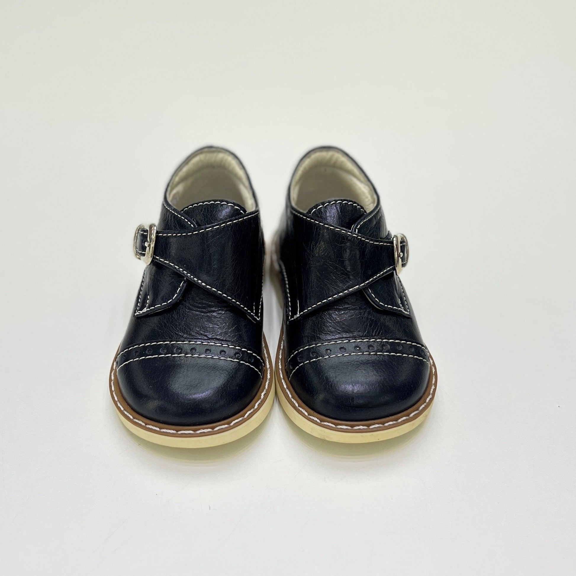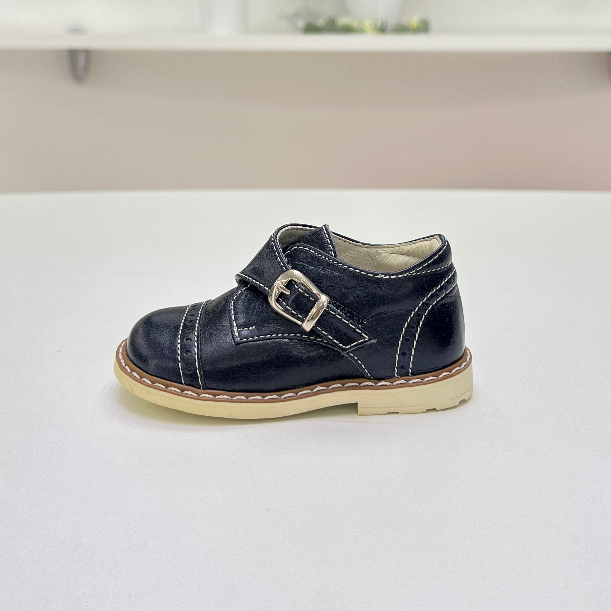 Scarpa con fibbia e impunture a contrasto, suola in gomma antiscivolo e plantare anatomico. Un modello comodo e distintivo, ideale per uno stile curato e quotidiano.