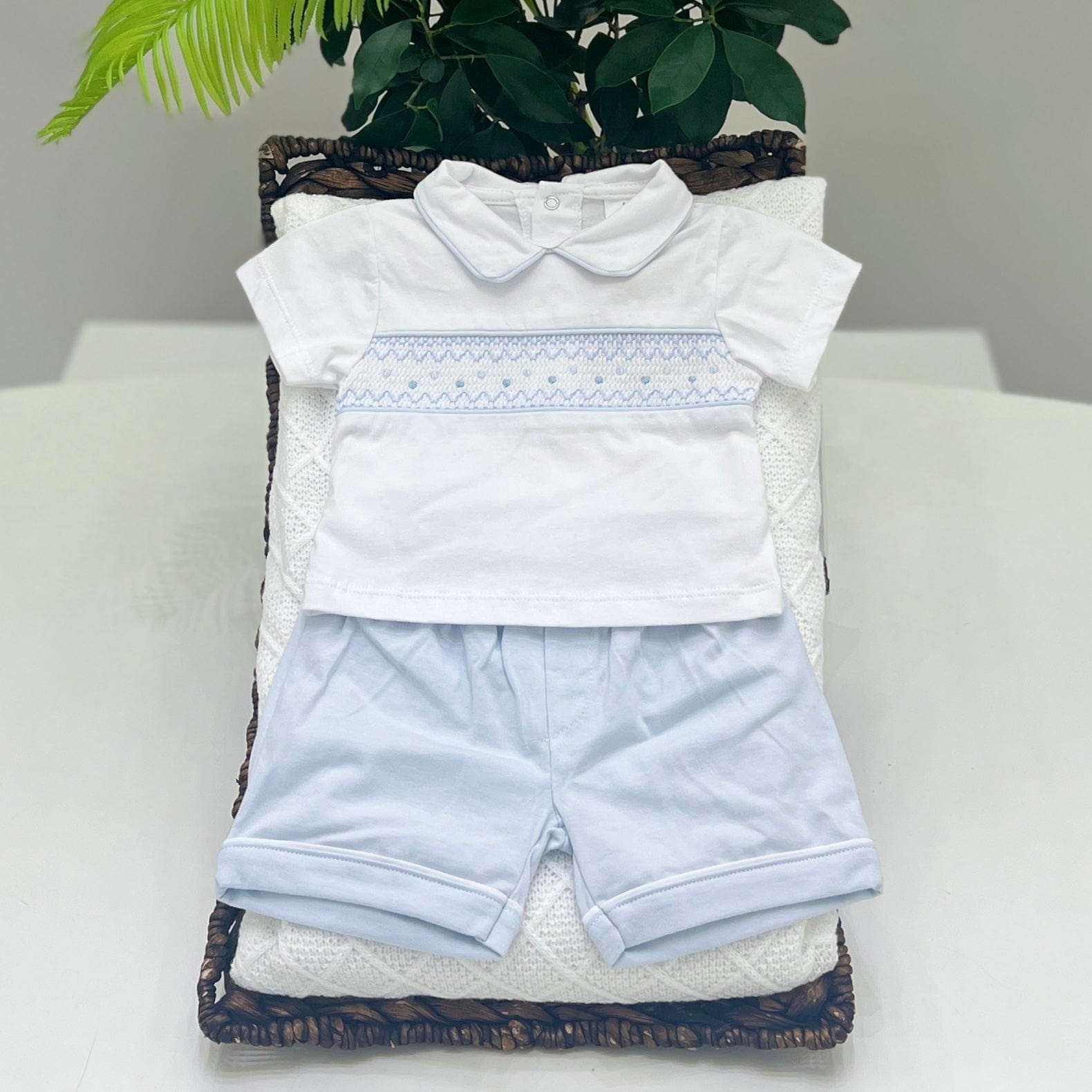 Completo in fresco cotone per neonato, composto da maglia con punto smock e pantaloncini. Un capo pratico e comodo, che offre eleganza e freschezza per la pelle delicata del neonato, perfetto per le giornate più calde e per la vita quotidiana.