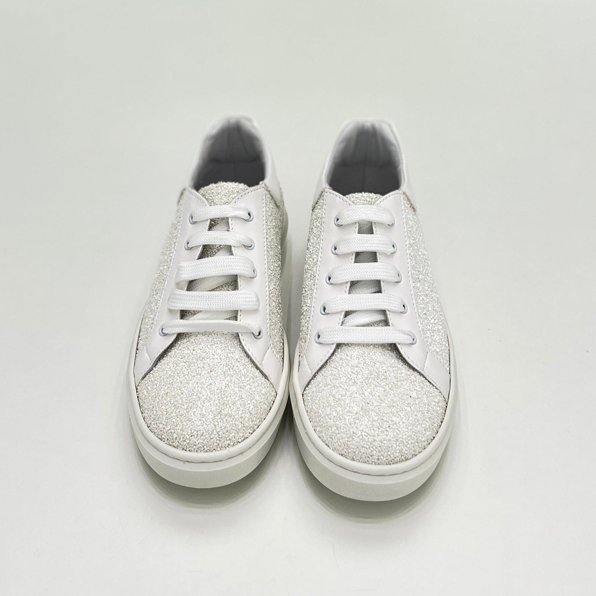 Sneakers bimba con glitter bianchi e lacci, dal design brillante e raffinato, ideali per completare con stile ogni look.