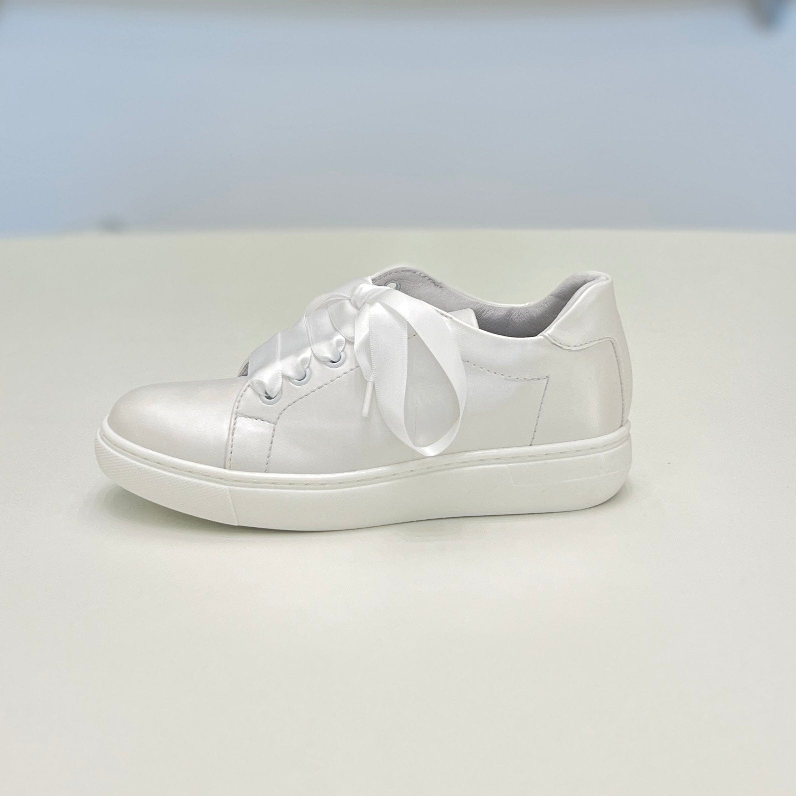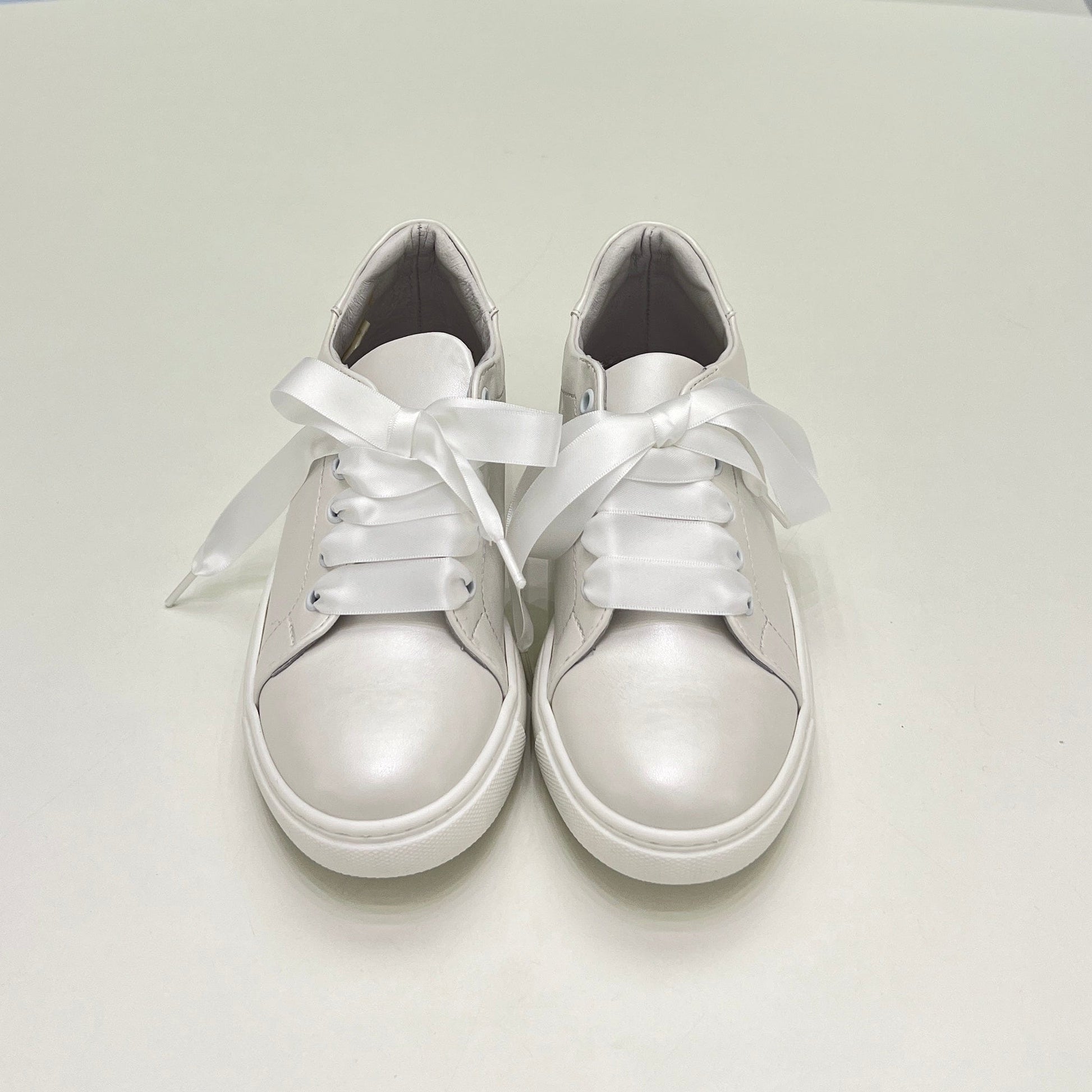 Sneakers bimba in pelle bianco perlata con lacci in raso, eleganti e raffinate, perfette per un tocco di classe in ogni occasione.