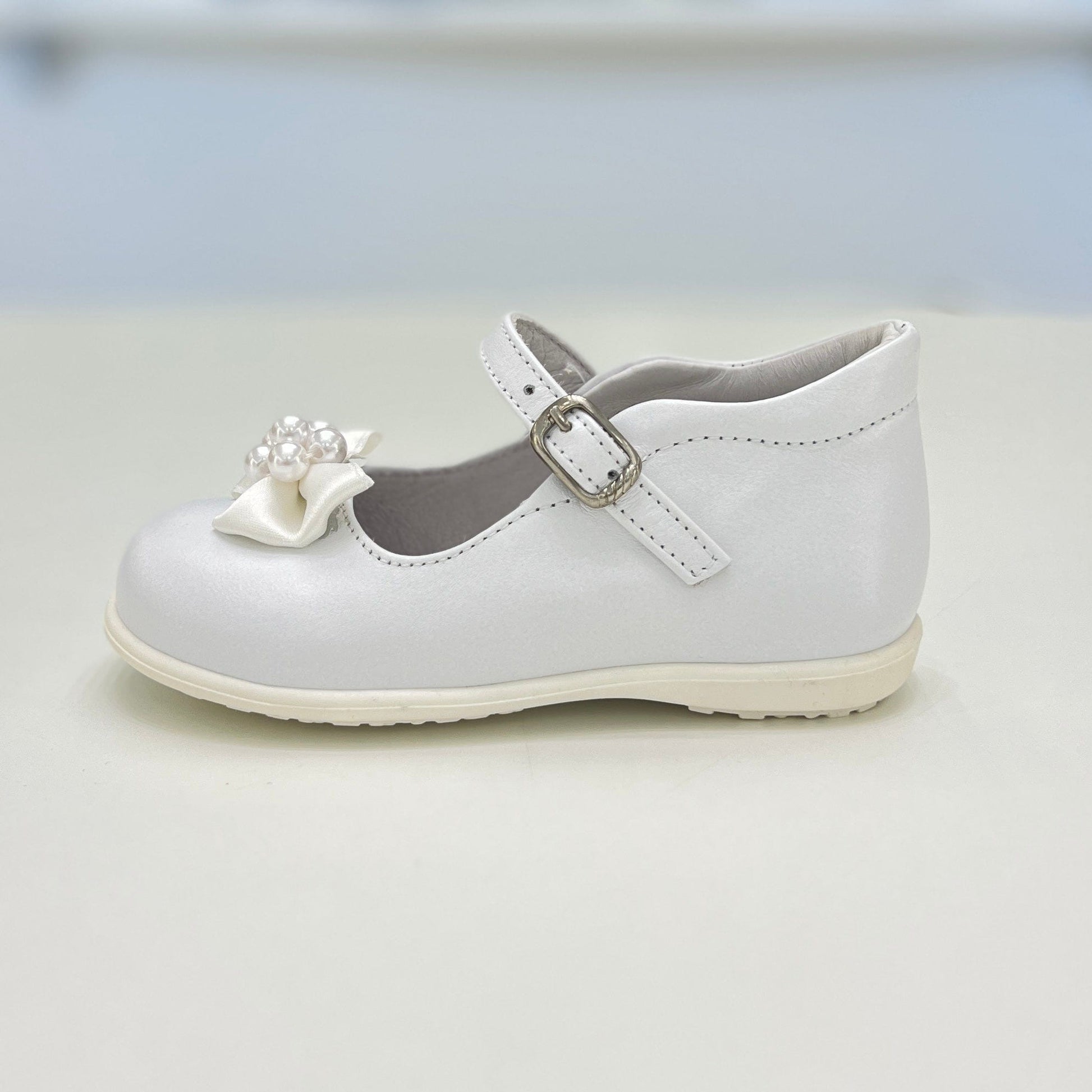 Ballerina primi passi bimba in pelle bianco , decorata con fiocchi e perline, cinturino con fibbia, plantare anatomico e suola antiscivolo.