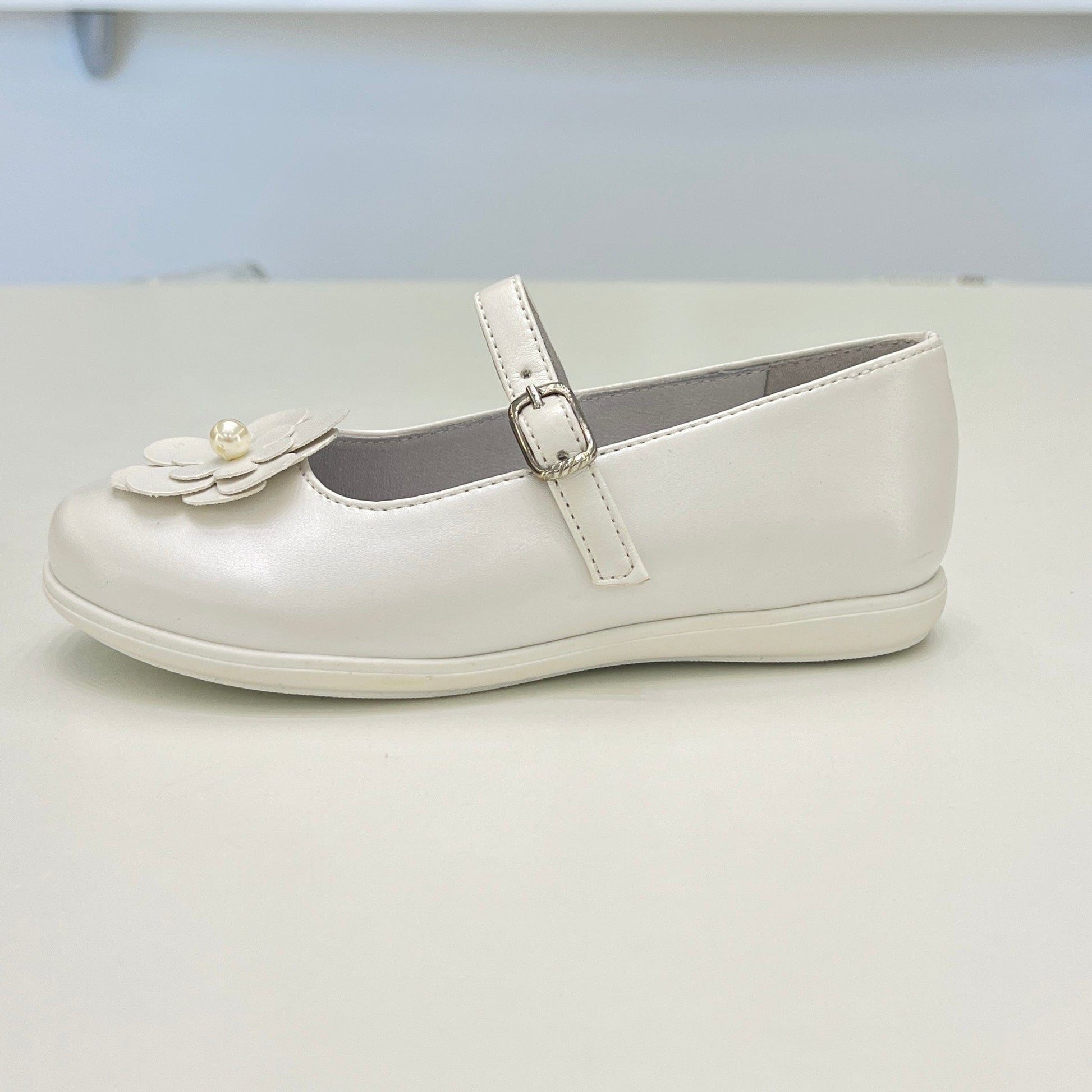 Ballerina bimba in pelle con fiore, cinturino con fibbia, plantare anatomico e suola antiscivolo, ideale per garantire comfort e stile in ogni passo.