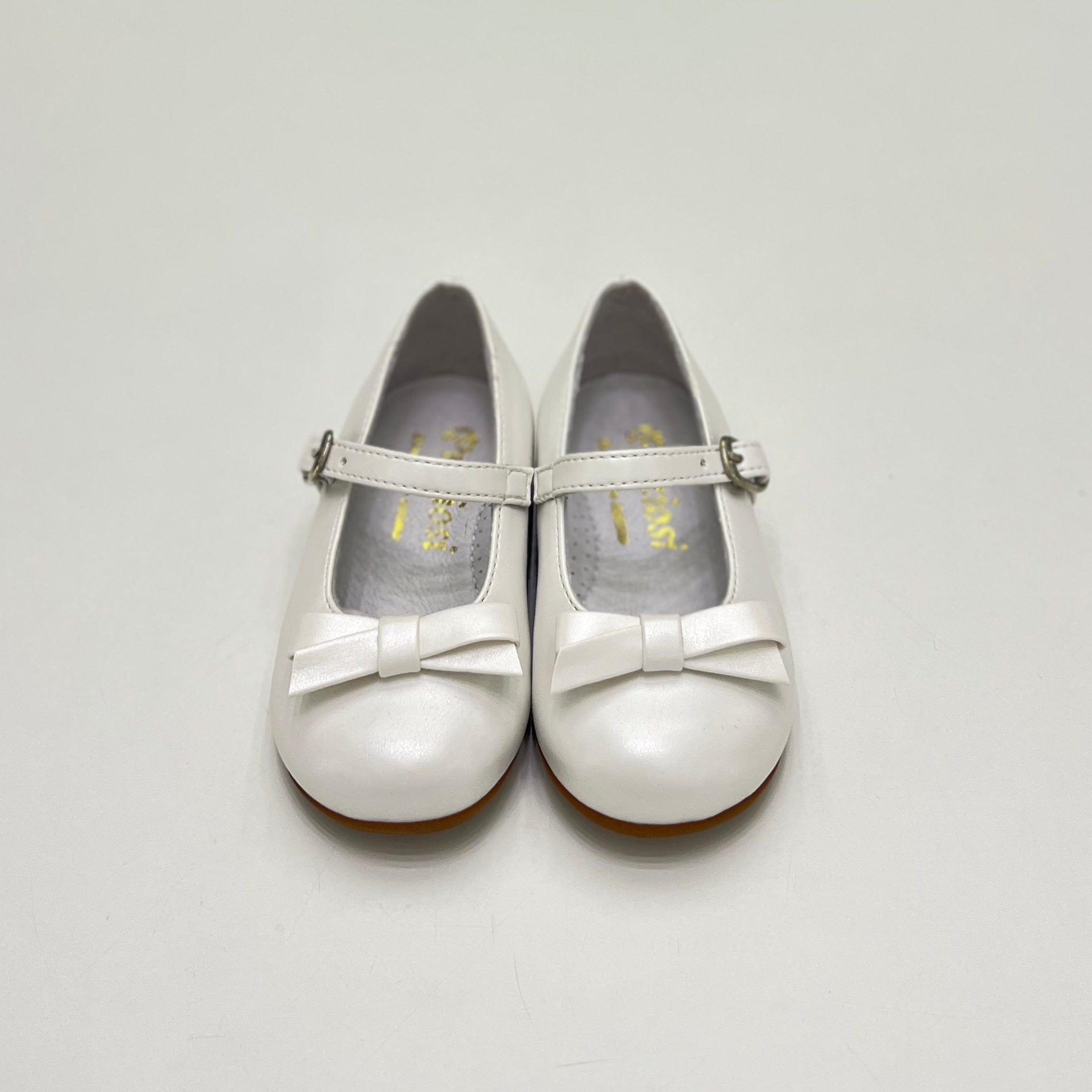 Ballerina primi passi bimba in pelle bianco perlato, decorata con fiocchetti, cinturino con fibbia, plantare anatomico e suola antiscivolo.