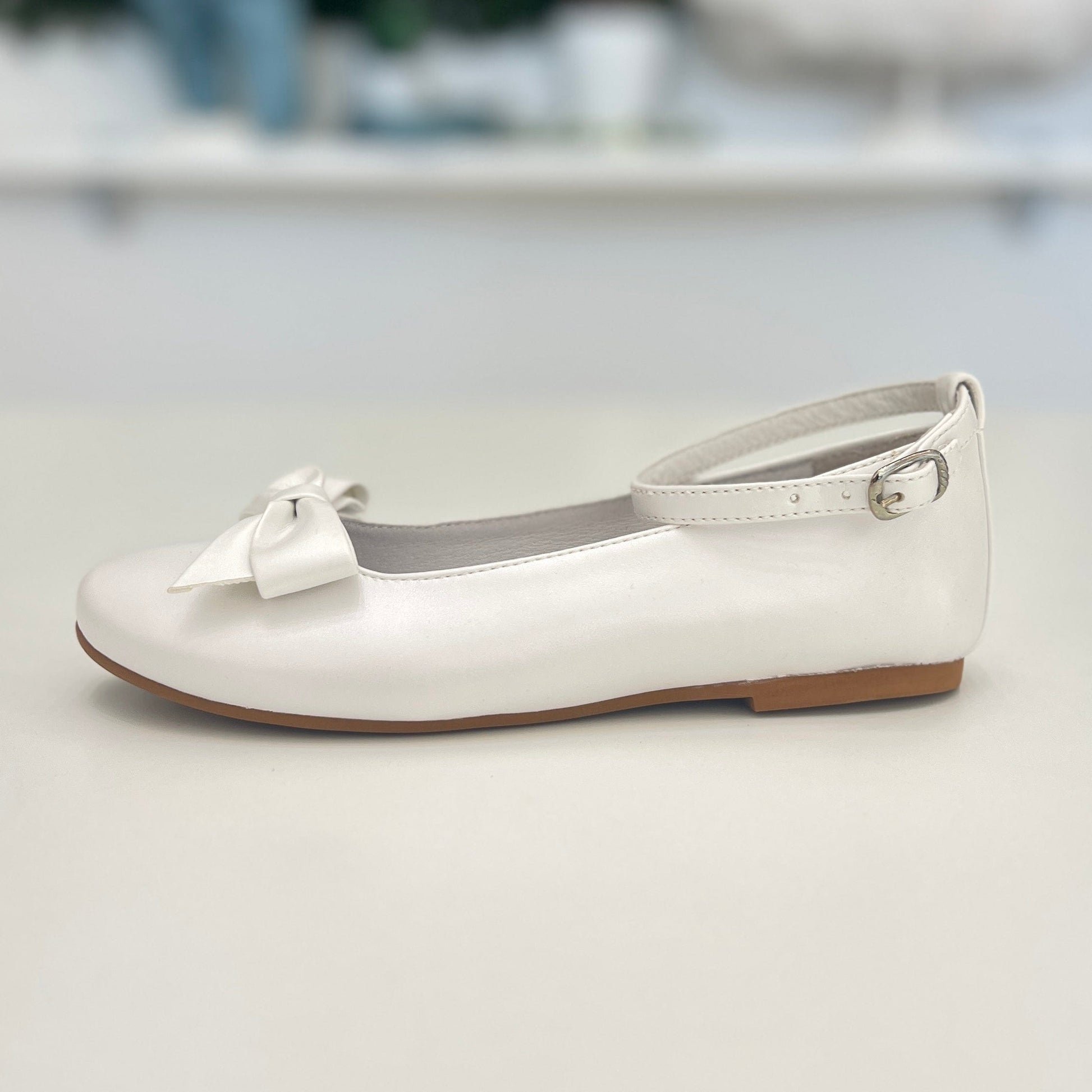 Ballerina bimba bianco perla in pelle con fiocchi e cinturino alla caviglia, raffinata e confortevole, perfetta per look eleganti.