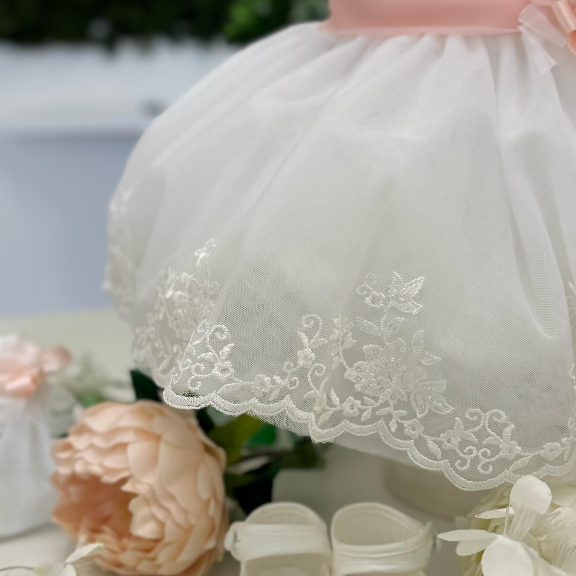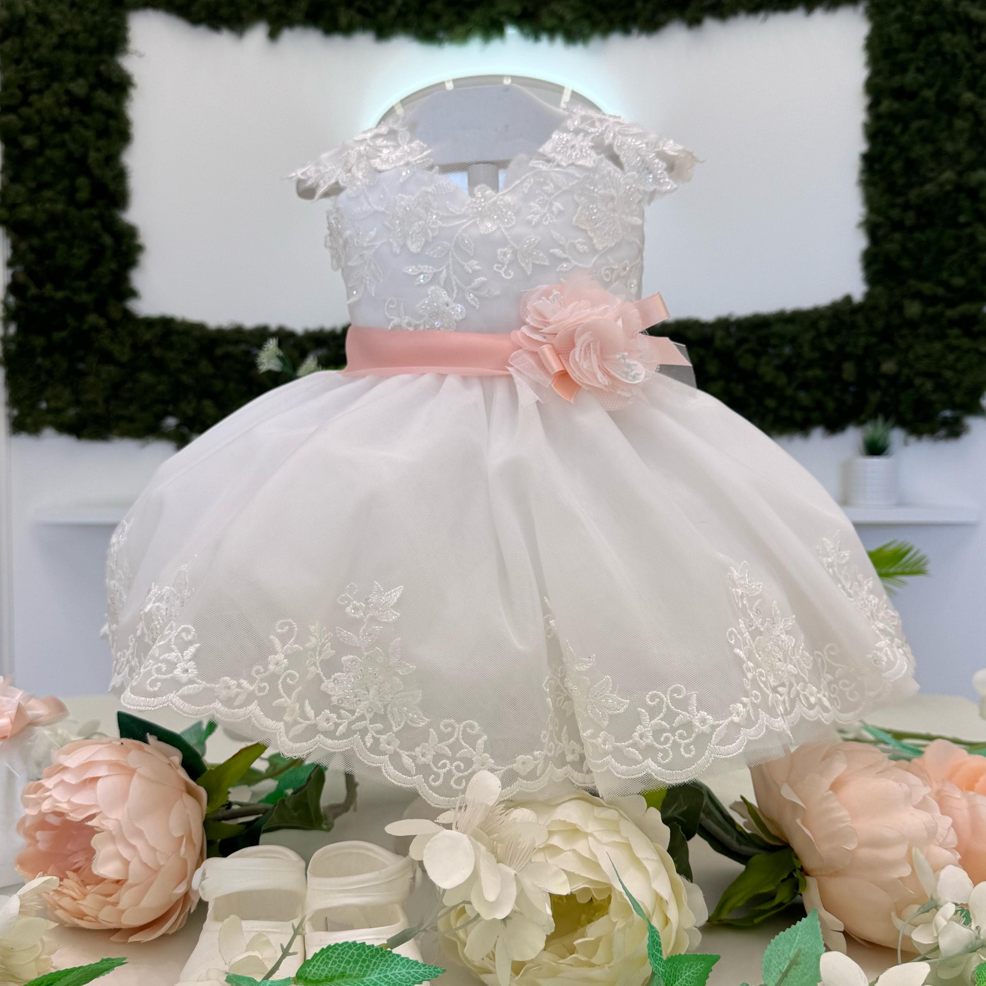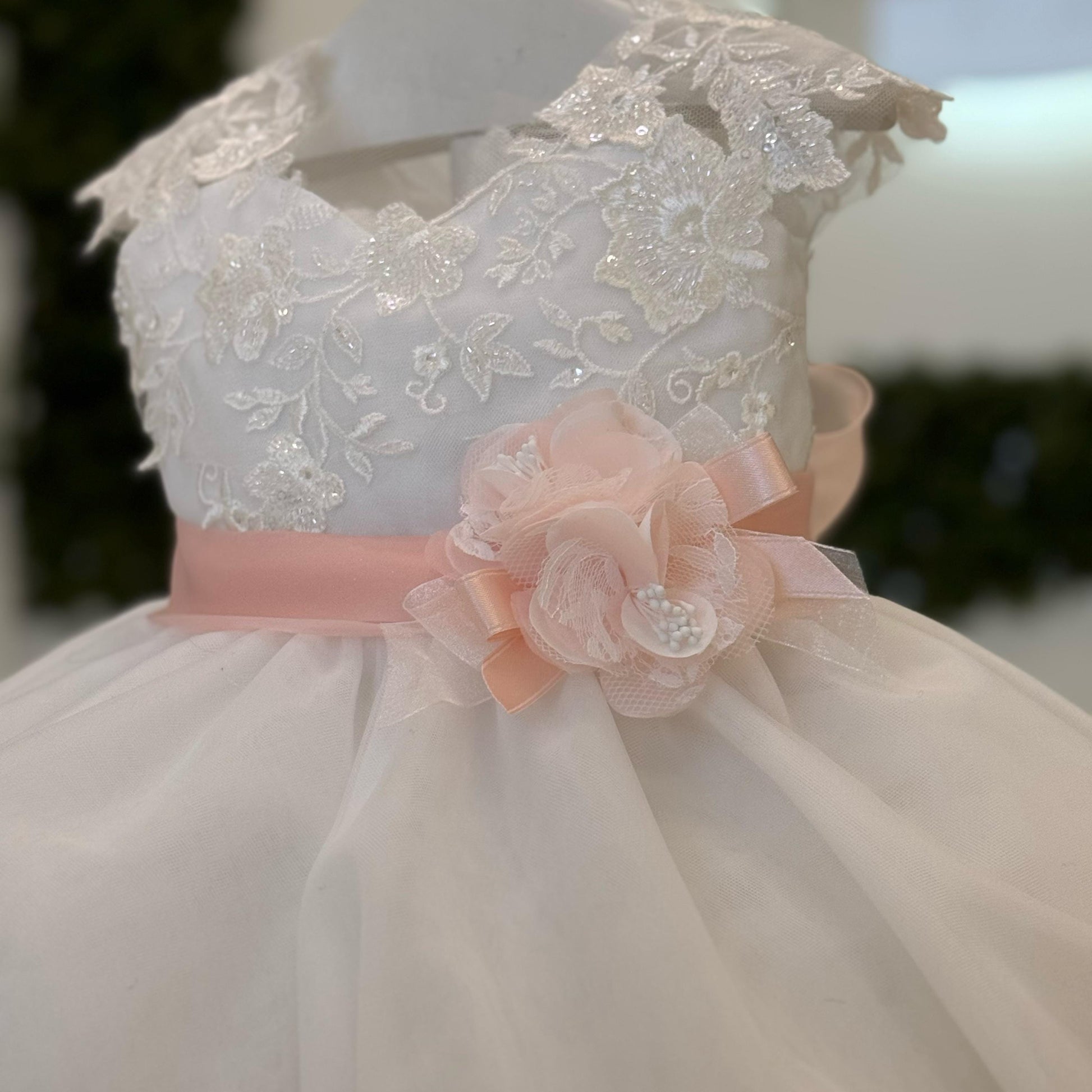 Un abito battesimale che unisce eleganza e raffinatezza: il corpino in tulle con scollo a cuore esalta la delicatezza del design, mentre la gonna ampia, bordata in prezioso pizzo ricamato, aggiunge un tocco di romanticismo. La coda in vita dona movimento e maestosità, completata da una cintura in organza color cipria, impreziosita da un raffinato dettaglio floreale. Un capo esclusivo per un’occasione indimenticabile.