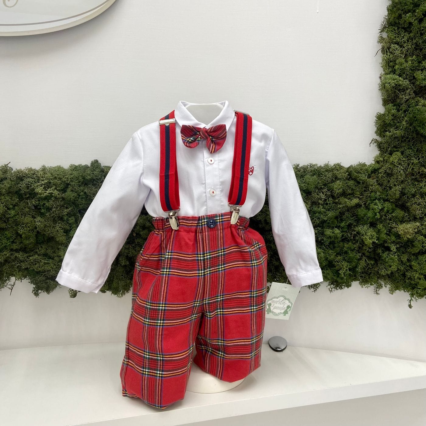 Completo pantalone lungo scozzese con bretelle e camicia con papillon
