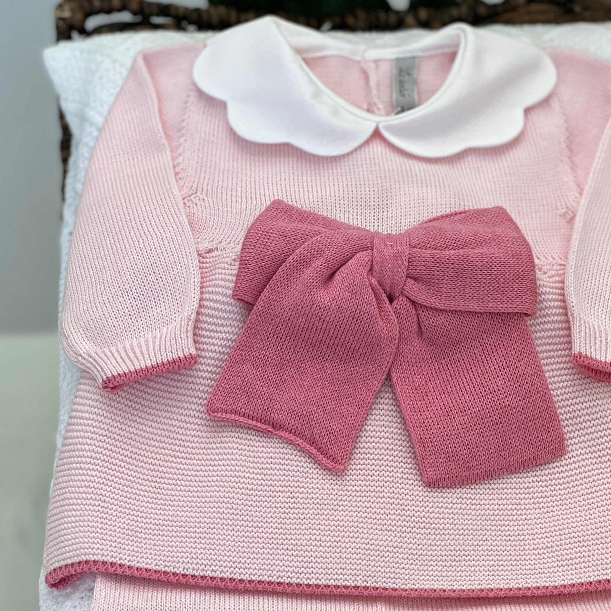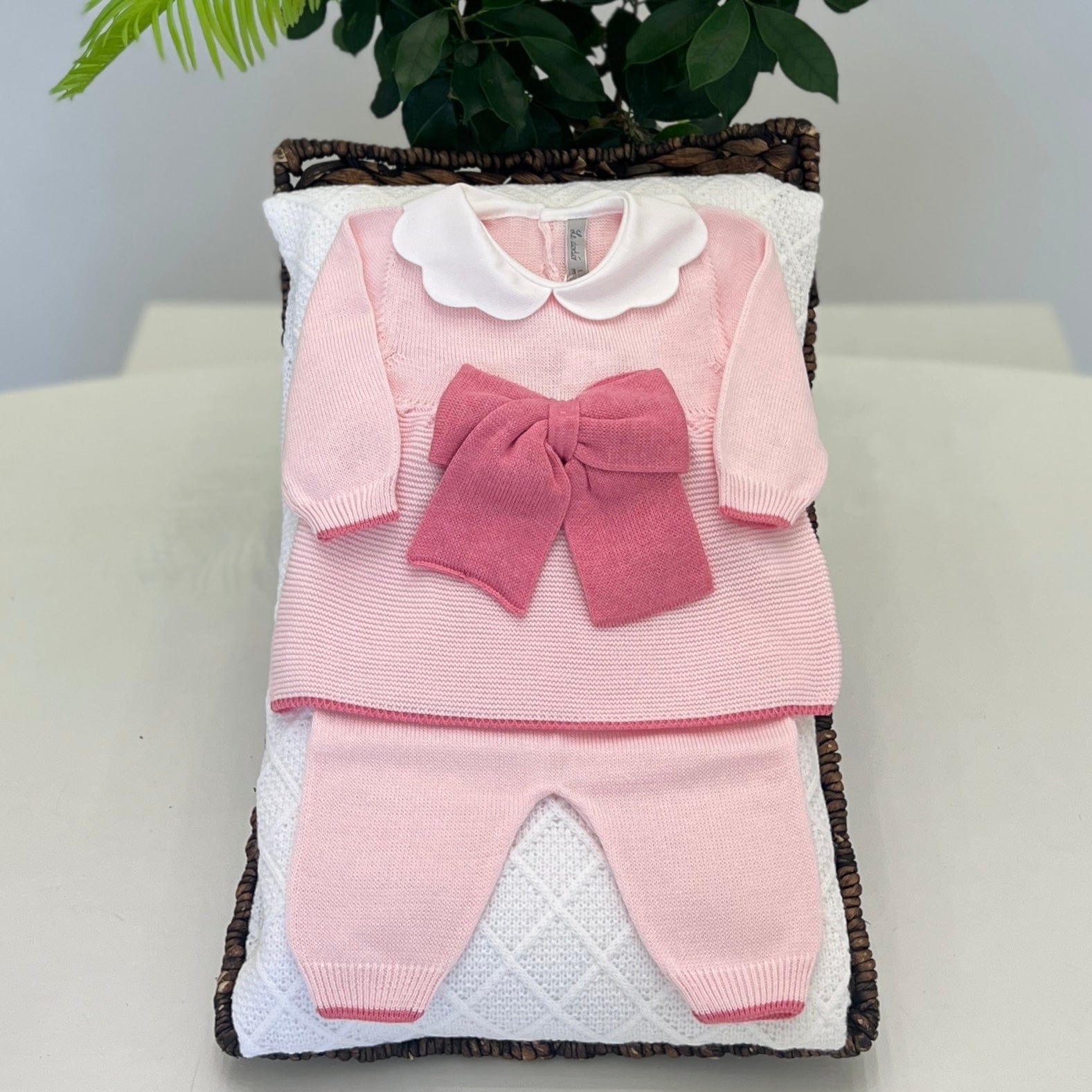 Ideale per un'uscita clinica primaverile o estiva, questa tutina spezzata in filo di cotone rosa offre morbidezza e comfort per i primi giorni di vita. La maglia a manica lunga è arricchita da bordi a contrasto e un fiocco rosa fragola al centro, mentre il colletto smerlato in piqué rosa chiaro aggiunge un elegante dettaglio. Leggera e traspirante, è perfetta per le nascite in primavera e estate, garantendo freschezza e delicatezza.