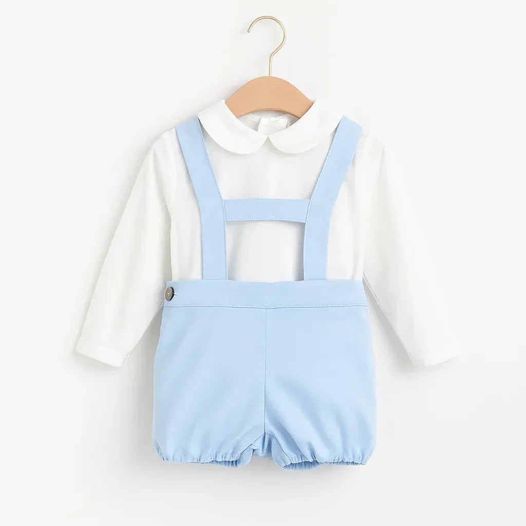 Completo elegante per neonato composto da camicia bianca con colletto tondo e bretelle abbinate, abbinato a shorts azzurri con elastico al fondo e bottoni laterali. Un insieme semplice, raffinato e intramontabile, perfetto per cerimonie e occasioni speciali.