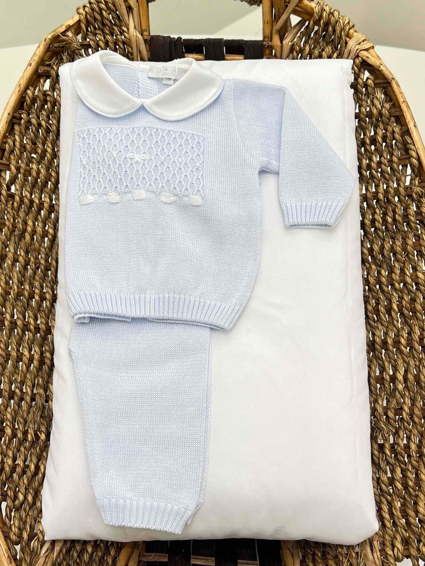 Maglia manica lunga con colletto in piqué, trama ricamata con rombi e fiocchetti e passanastro.