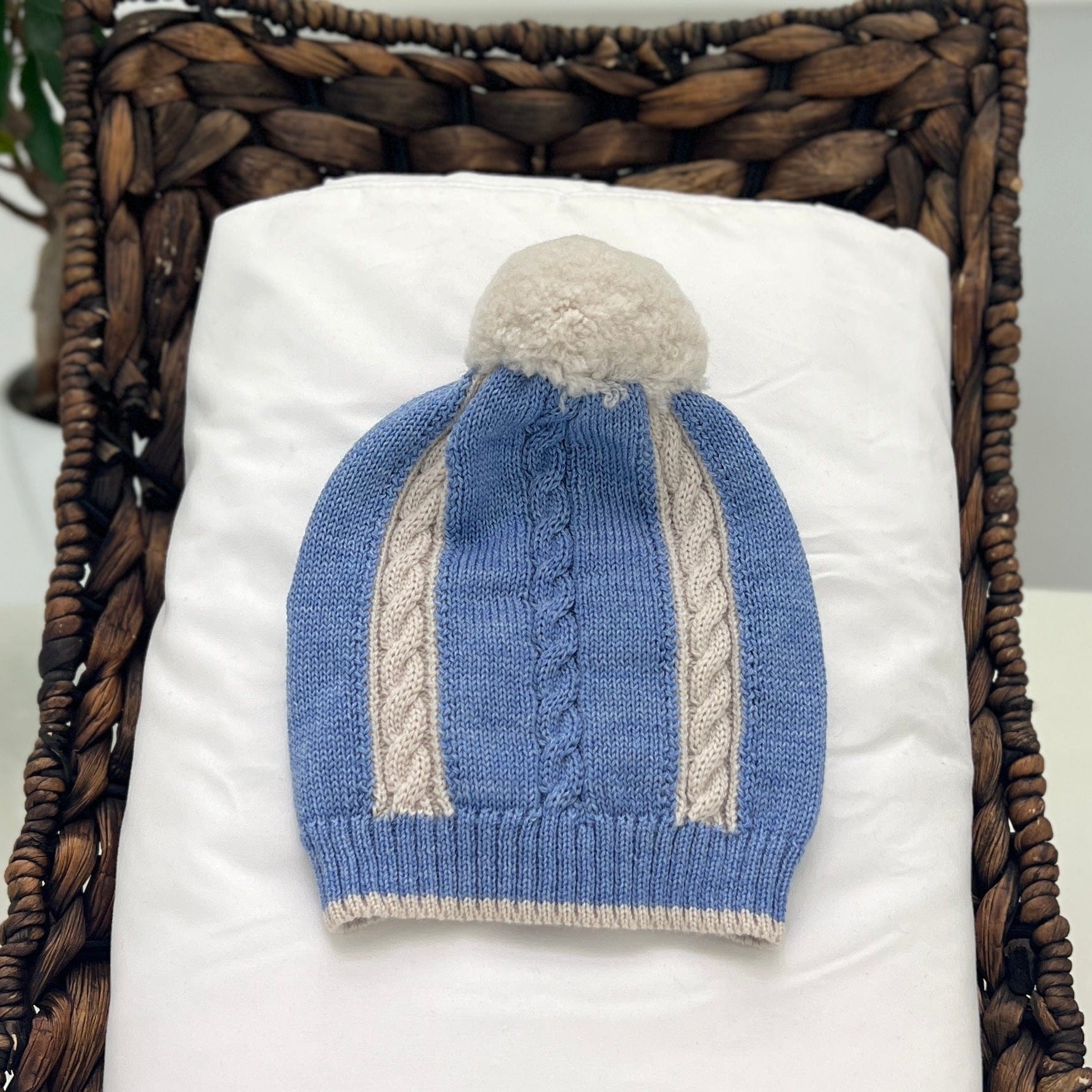 Cappellino in lana merino per neonato. Realizzato in lana merino di alta qualità, offre una morbidezza eccezionale e un calore ottimale per la testa del neonato. Il cappellino è leggero e traspirante, assicurando comfort senza surriscaldare. Dal design elegante, con lavorazione a trecce, con colori predominanti blu denim e tortora, può essere facilmente abbinato ad altri capi del guardaroba del neonato, aggiungendo un tocco di eleganza e protezione nelle giornate più fredde.