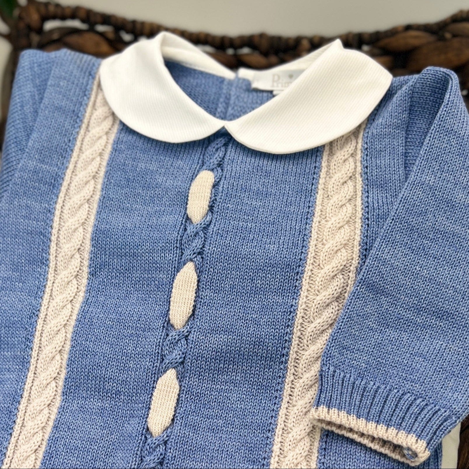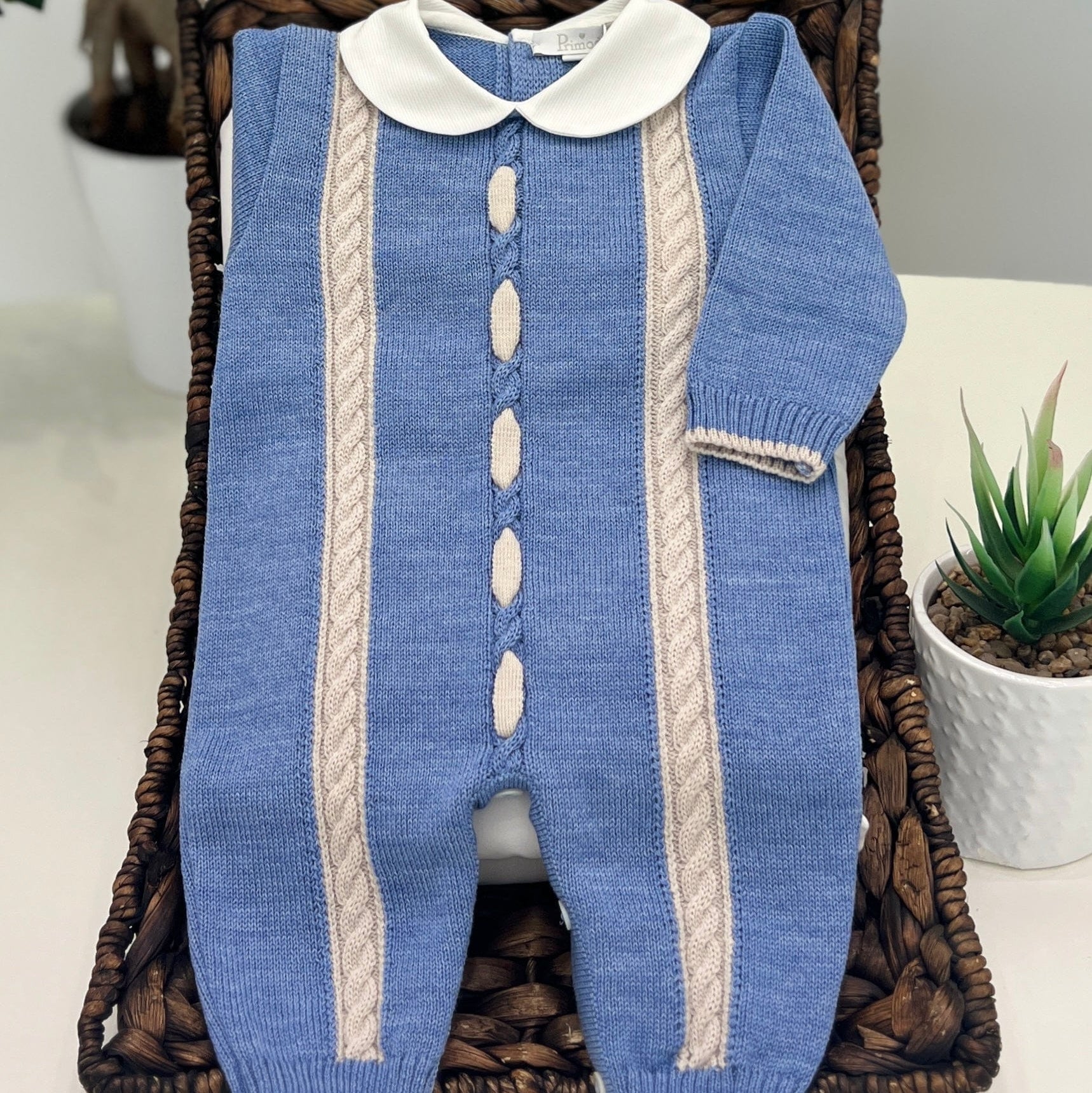 Una tutina per neonato in lana merino con lavorazione a trecce, nei colori predominanti blu denim e tortora, è un capo accogliente e chic. La lana merino assicura morbidezza e calore, ideale per la delicata pelle del neonato. La lavorazione a trecce aggiunge una texture ricca e visivamente interessante. Il design presenta un colletto rotondo che contribuisce a un look dolce e classico. I colori blu denim e tortora si combinano armoniosamente, offrendo un aspetto moderno e sofisticato, perfetto per tenere il neonato comodo e stiloso