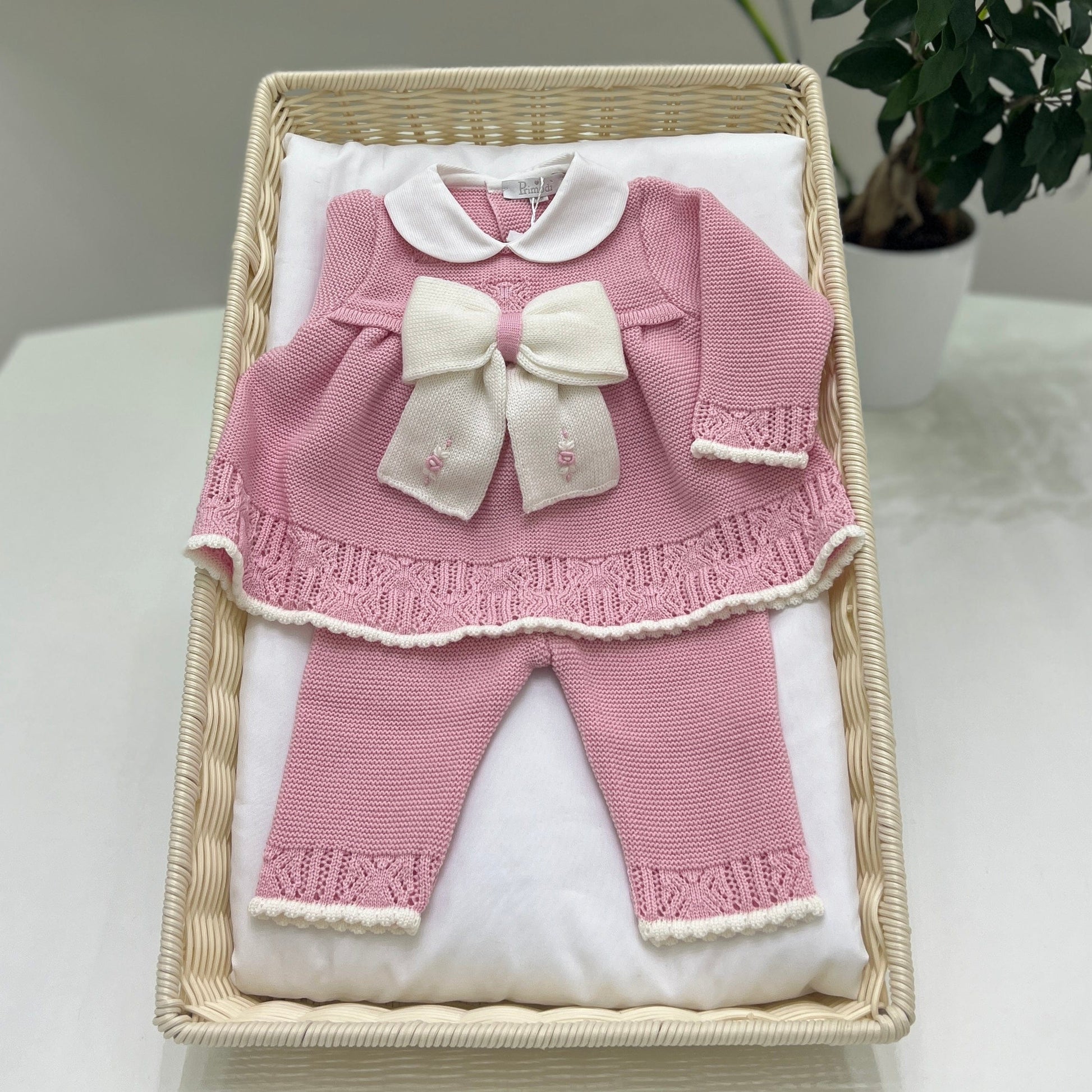 Tutina due pezzi in pura lana lavorata a maglia con trafori lungo i bordi, fiocco centrale e colletto in piqué di cotone.