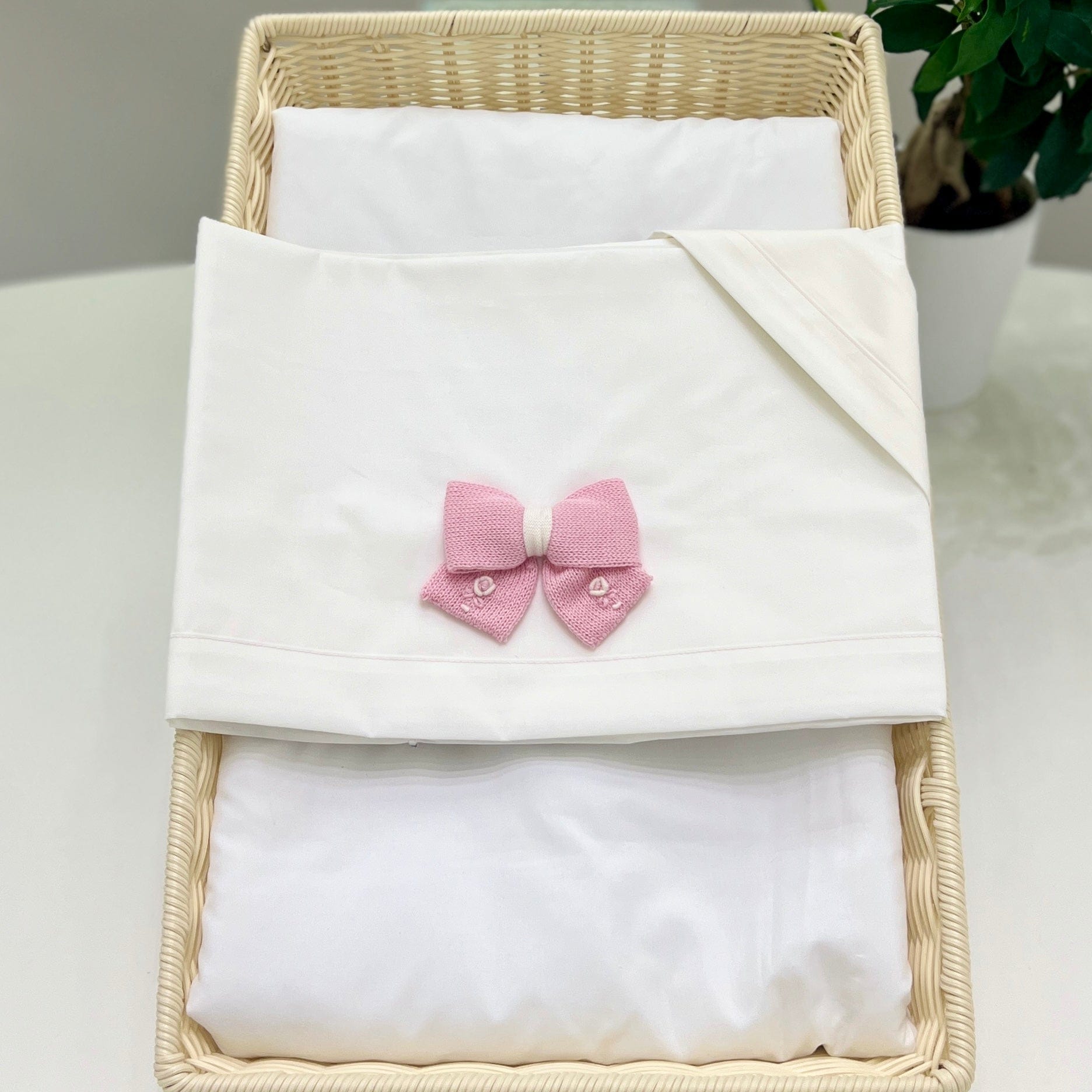 Set lenzuola per carrozzino in cotone con fiocco in lana con ricami.