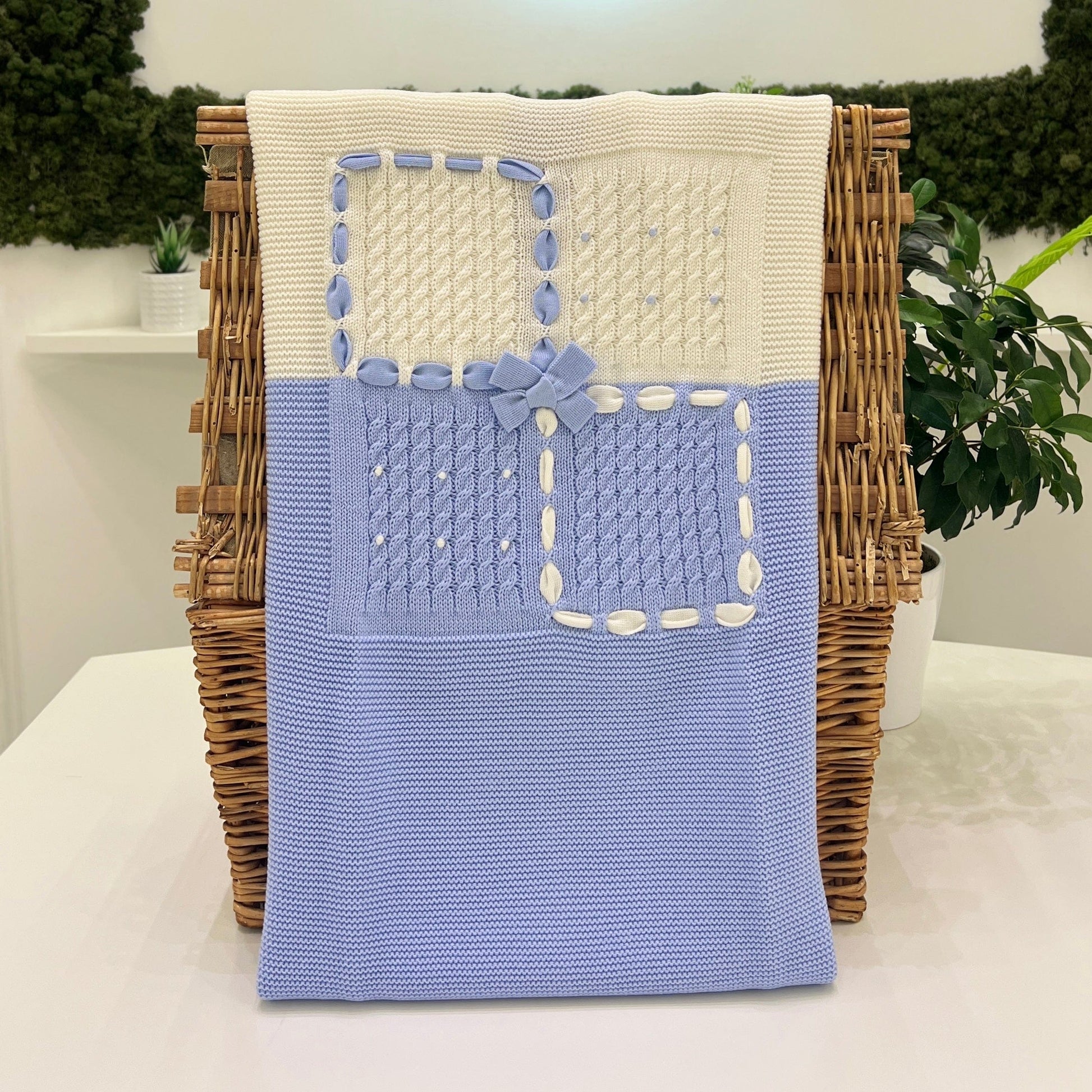 Coperta sfoderata bicolore in pura lana con lavorazione a trecce, passanastro e fiocchi.