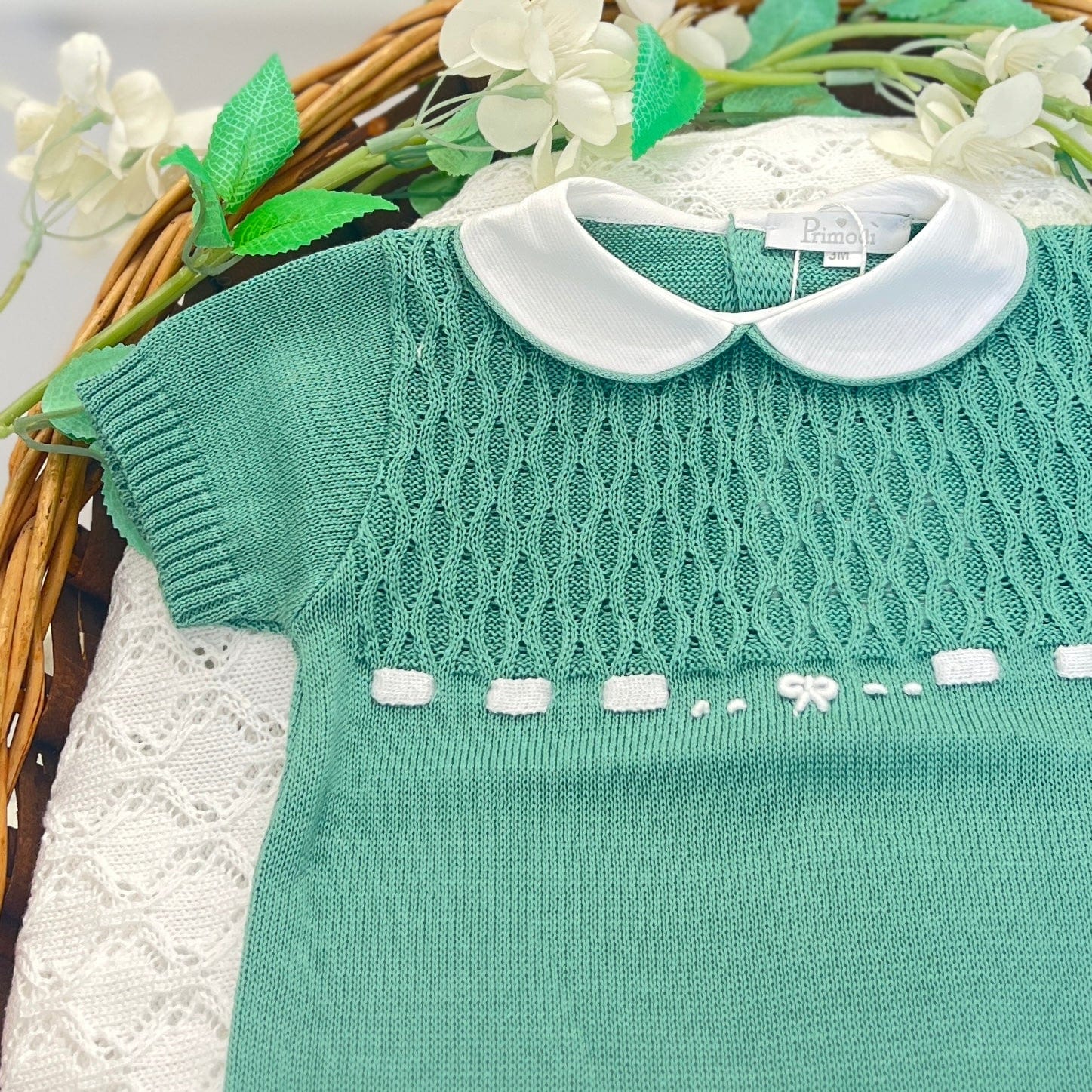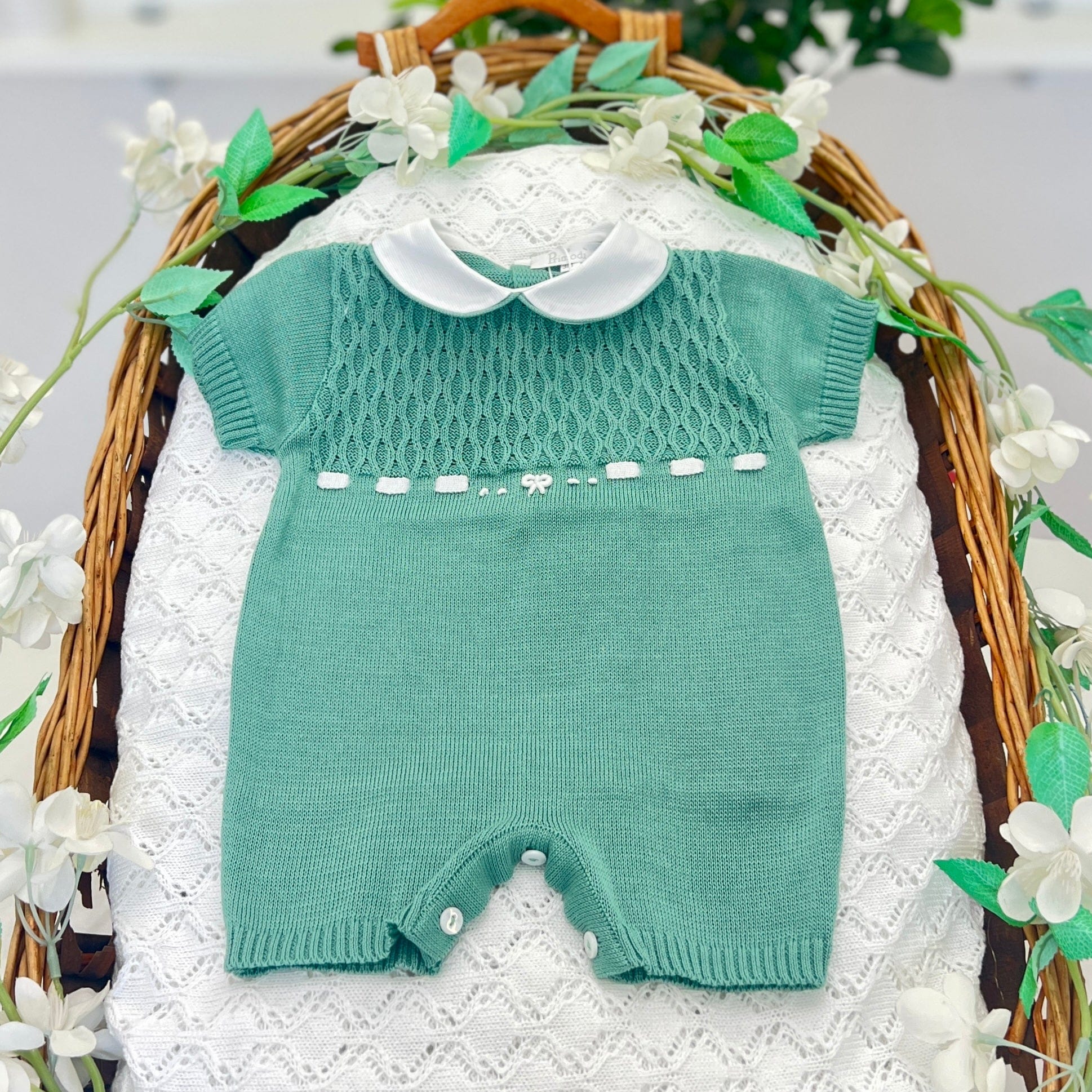 Tutina pagliaccetto corta in filo di cotone per neonato, con dettagli in punto smock e ricami nodo d’amore. Colletto bianco a contrasto per un tocco classico ed elegante.