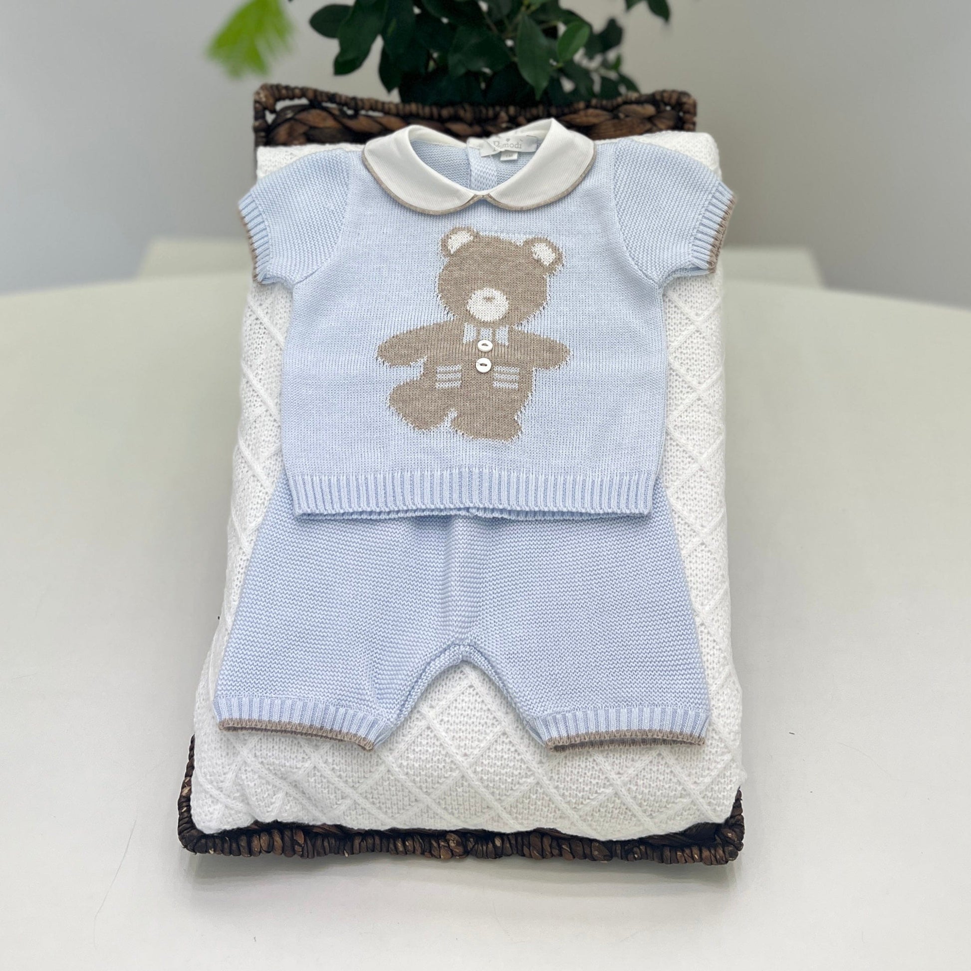 Completo due pezzi per neonato in filo di cotone celeste. La polo con colletto in piquet e bordino tortora, arricchita da un orsetto ricamato, si abbina perfettamente ai bermuda coordinati. Un must-have per le nuove nascite, ideale per accogliere il piccolo con eleganza e morbidezza.