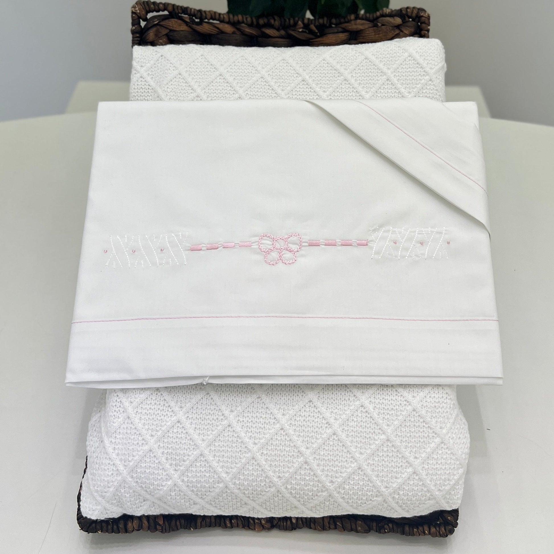 Set lenzuola in cotone, composto da sopra, sotto con angoli e federa. Impreziosito da una accurata lavorazione ricamata con fiocco centrale, aggiunge un tocco di dolcezza alla culla o al lettino. Morbido e raffinato, perfetto per accogliere il neonato con comfort ed eleganza.